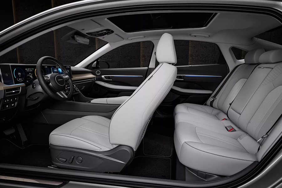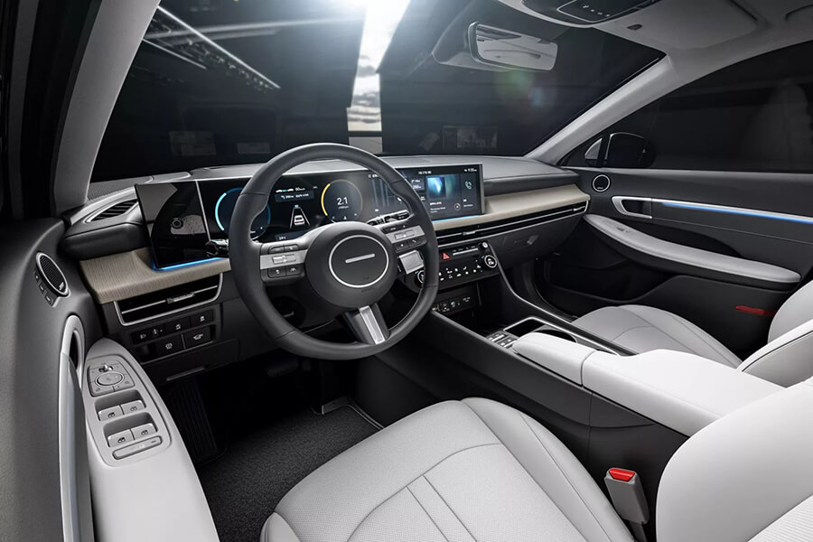 來到車內,Sonata的車艙設計亦大幅改由雙12.3吋曲面螢幕連貫構成的儀表及中央螢幕為主軸,排檔桿也改以線傳撥桿的形式出現在方向機柱上。此外Hyundai也宣稱在內飾材質上進行改良,以雅緻的內飾色彩組合提升乘坐體驗、同時強化運動感與精緻度。