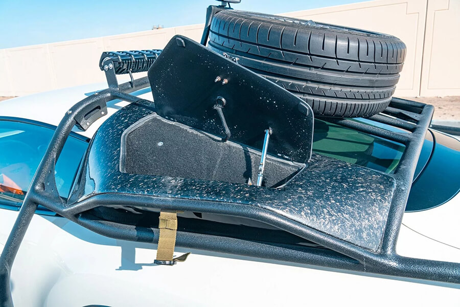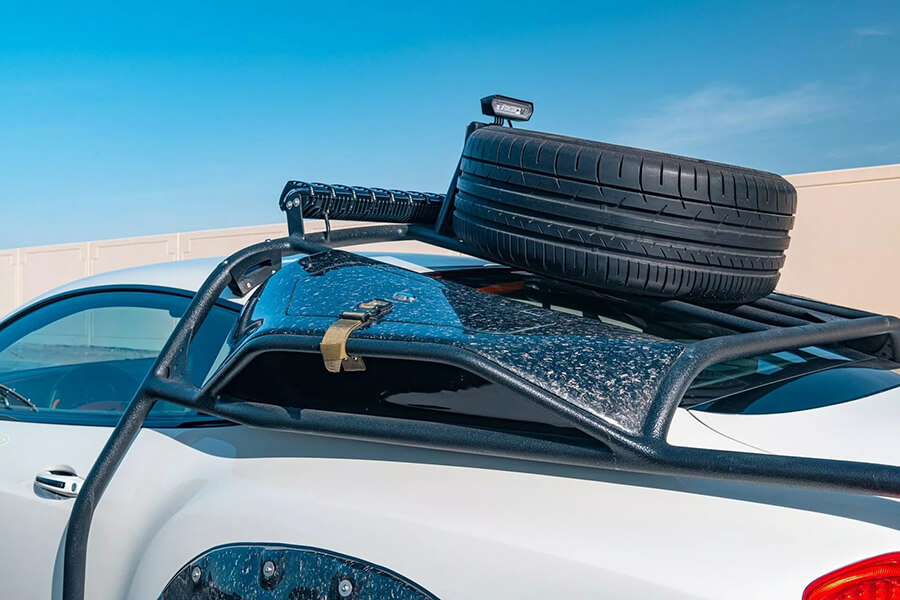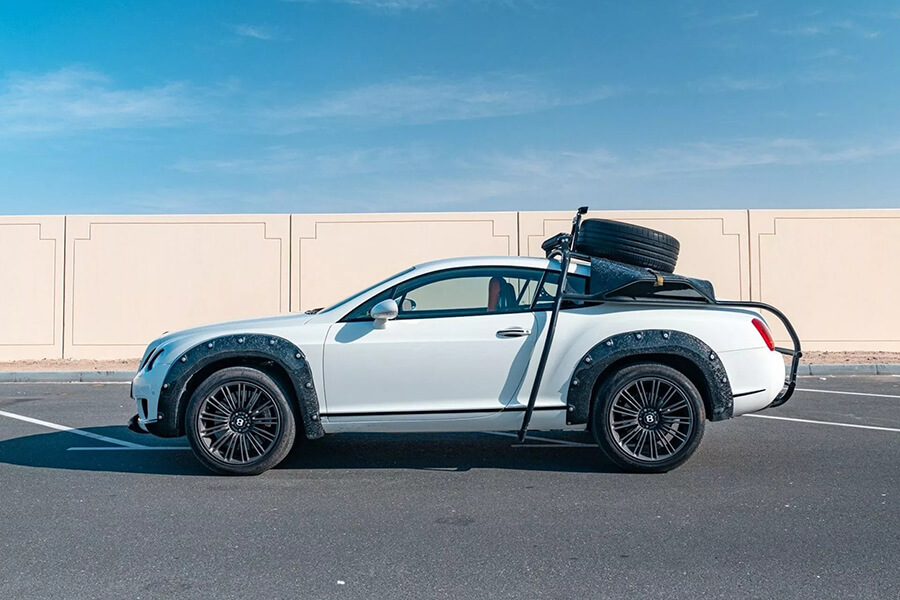 這部在collectingcars.com網站出售的Continental車主顯然想要有一部更具跑格的越野賓利,因此為愛車安上了誇張的碳纖維輪拱,下方安放著四條Pirelli Scorpion Verde四季休旅胎與20吋輪圈。雖然這般配胎設定顯然還是有朝向更”野”發展的空間,但在氣壓懸吊的支撐下也為此車創造更大的離地高、同時可以方便你趴下、看看那些已經遍布車底的護板、前後保桿等等。後方的保桿甚至在車身後半形成籠型結構,上方有著碳纖維材質的置物空間、備胎及車頂照明燈等等。此外車主還安裝了防水/防火線組及RV防水插座,好方便讓你能以此車從事露營活動
