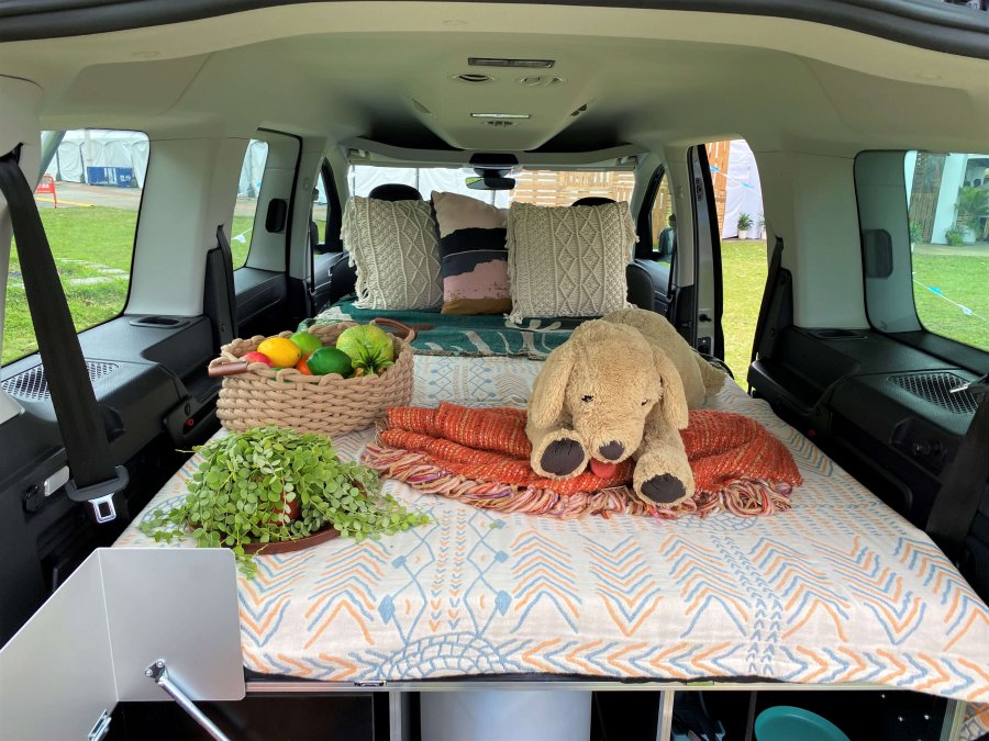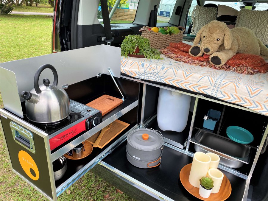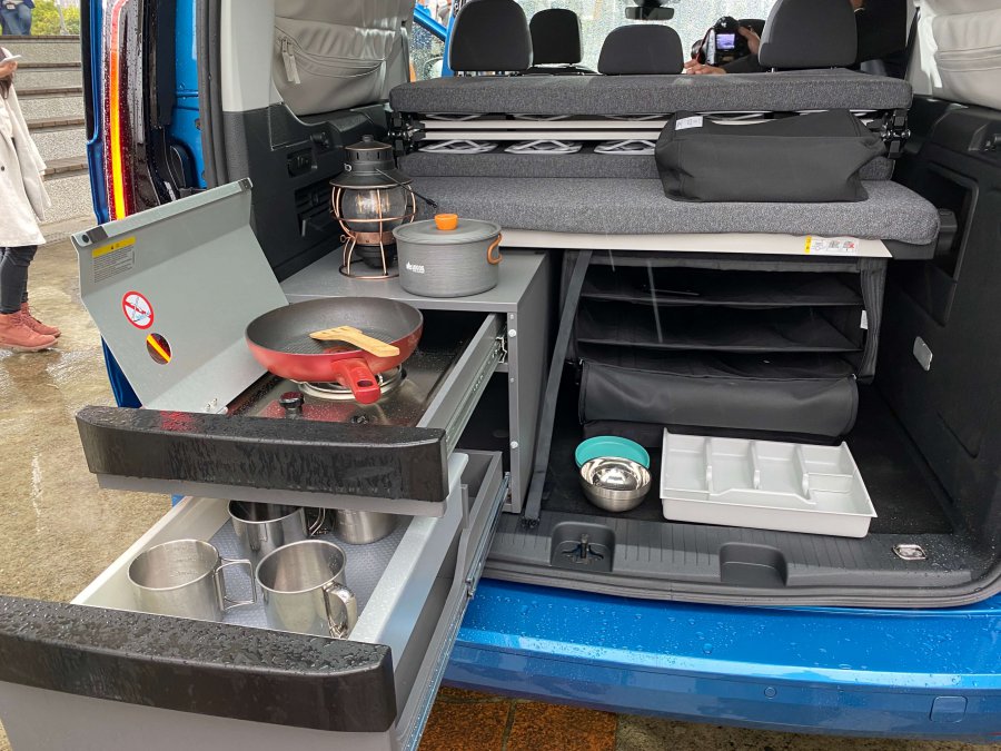 此外在第二排座椅之後,原廠還規劃了完整度相當高的收納櫃,裏頭包含專屬的行動迷你廚房配有一套隱藏式流理台,提供單爐烹飪瓦斯爐、餐具置放廚物區,物品收納更方便之外,另一側則搭配兩張摺疊椅與餐桌與雜物收納袋,讓戶外生活更輕鬆。