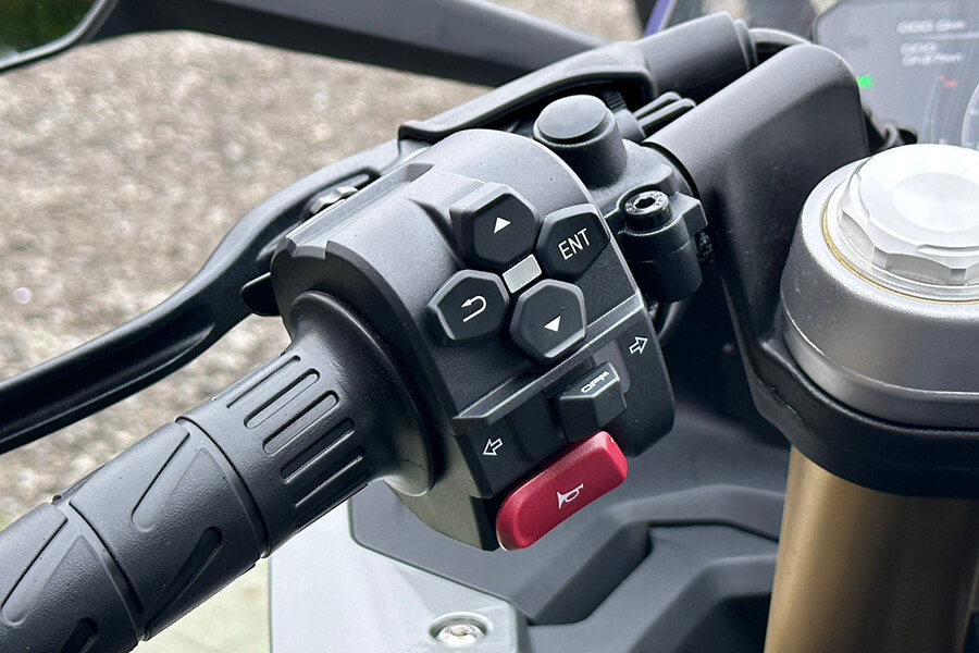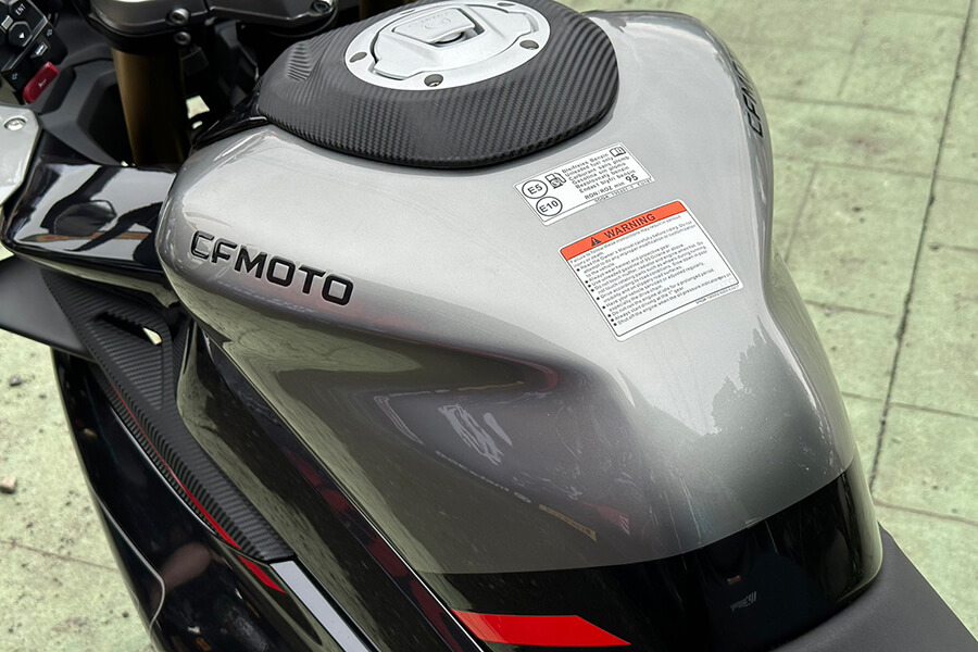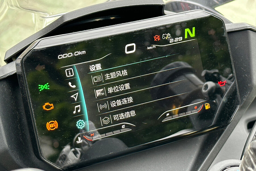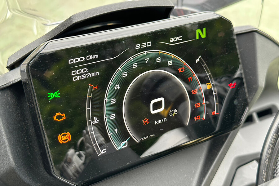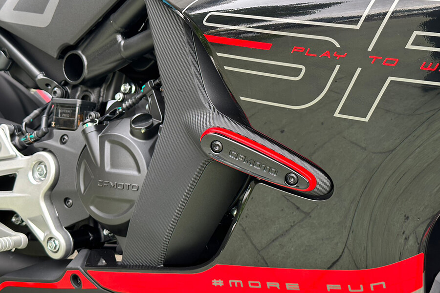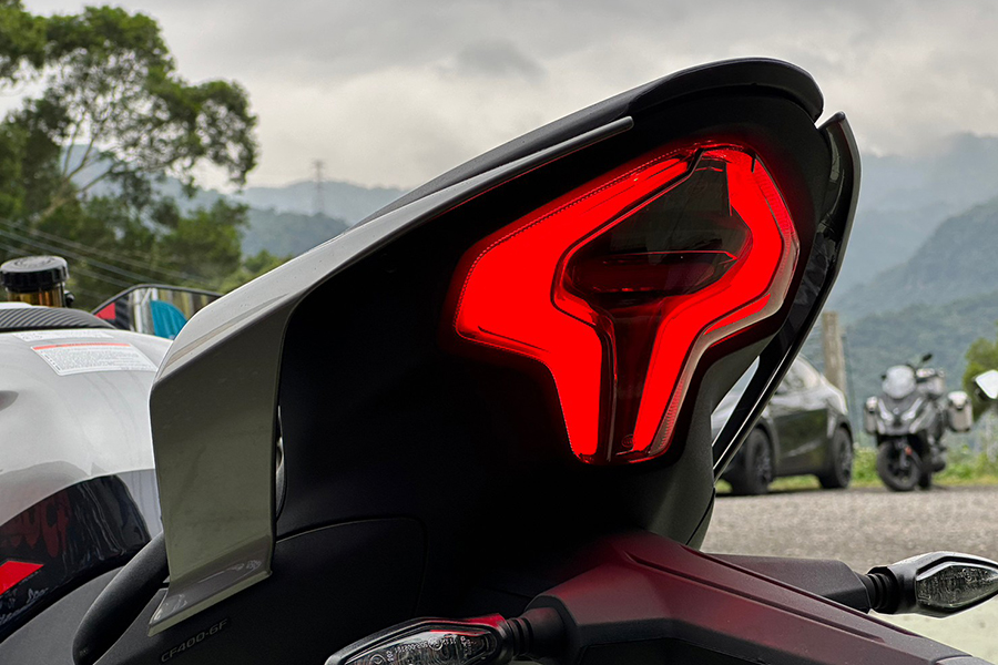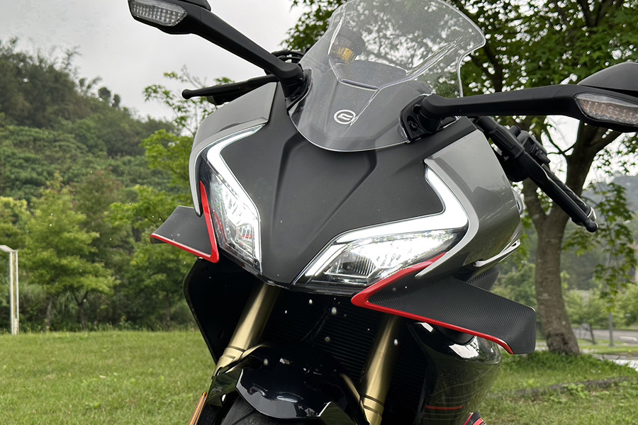 在騎姿部分,春風除了悉心調配騎士三角、以及油箱夾持感受,手把與腳踏部分也經過人體工學設計:請注意,此設定是為了符合450SR的車款定位,因此乘坐姿勢上呈現略代跑格、但不是非常激進的設定,若想要具有更激進的騎乘三角,CFMOTO也將競技腳踏列在原廠精品的清單之中。窄化的車身除了對置腳性多有幫助,原廠的795mm座高也可視需求換上785mm、815mm的坐墊。除此之外,這部動力向上威脅到500cc級距車款的跑車滿油裝備重量竟只有179kg(入油前168kg)。小編扭開電門,五吋的TFT全彩儀表不僅彩度鮮豔、切換介面亦相當流暢,光是原地操作就讓我激動不已…。
