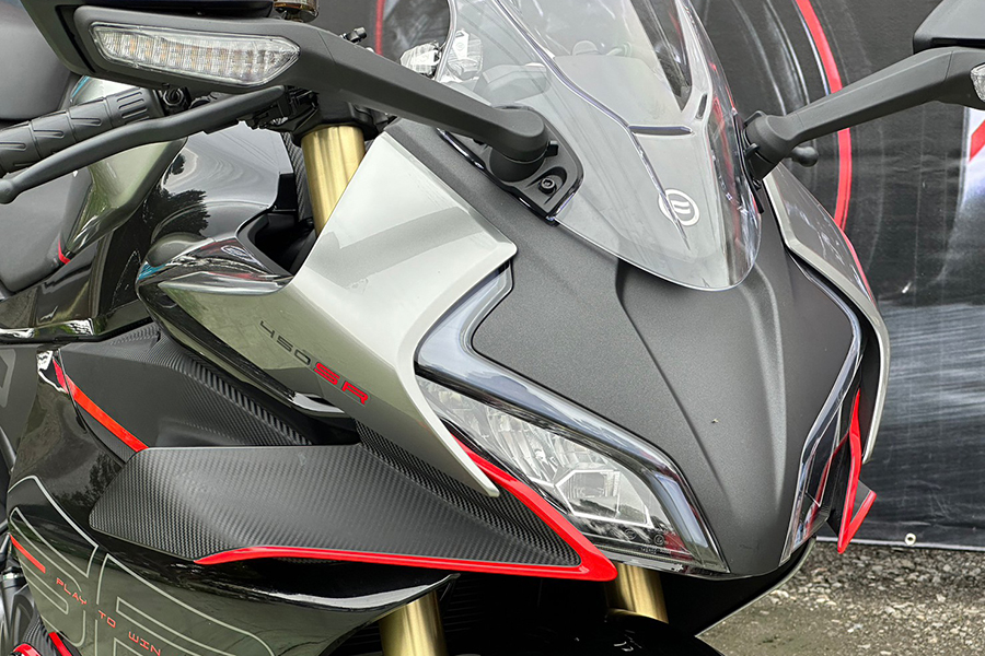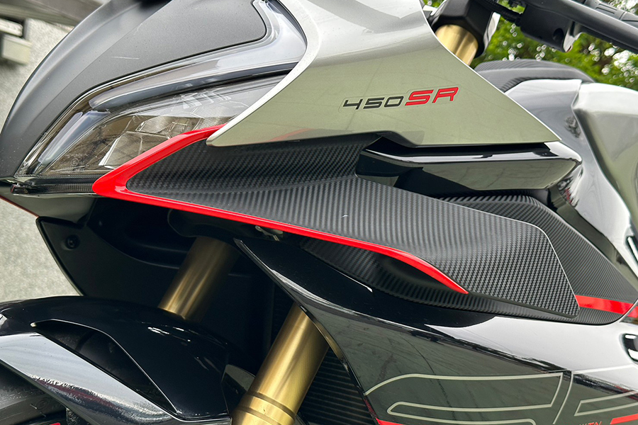 Last but not least,450SR的外表也非華而不實的皮囊:此番動感外型並非憑空捏造,而是在經過30小時以上的風洞測試、超過200小時的空力模擬,並進行二十多次的設計修改而成,分層的整流罩融入了現下頂級跑車常見的定風翼設計,同時。原廠並宣稱這對翅膀能在高速狀態下帶來更多的下壓力。
