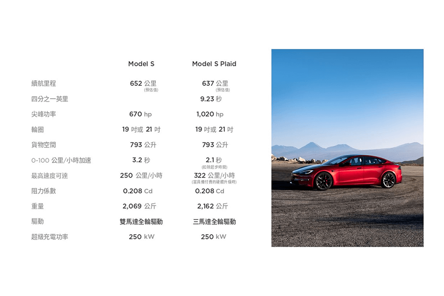 具備經典優雅車身線條的 Model S 續航里程最高可達 652 公里,其中 Model S Plaid 提供 0-100 公里/小時加速僅 2.1 秒與極低的 0.208 Cd 阻力係數,是專為追求速度、耐力和續航打造的車款。Model S 標準配備售價為 3,049,900 元起,Model S Plaid 標準配備售價為 3,369,900 元起。
