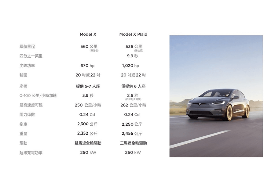 擁有獨特鷹翼門設計的休旅車款 Model X 具備其他 SUV 無可匹敵的動力與加速,最高續航里程可達 536 公里,超過 2,600 公升的儲物空間與 2,300 公斤的拖曳能力,堪稱地表最強 SUV,兼具實用性與各種家庭使用情境。Model X 提供五至七人座配置,標準配備售價自 3,489,900 元起;Model X Plaid 提供六人座配置,標準售價自 3,799,900 元起。