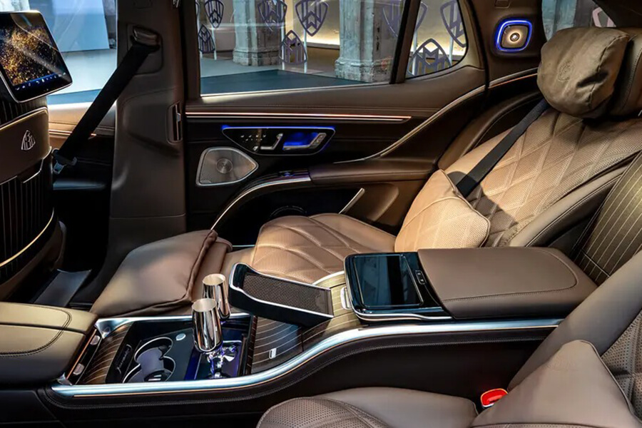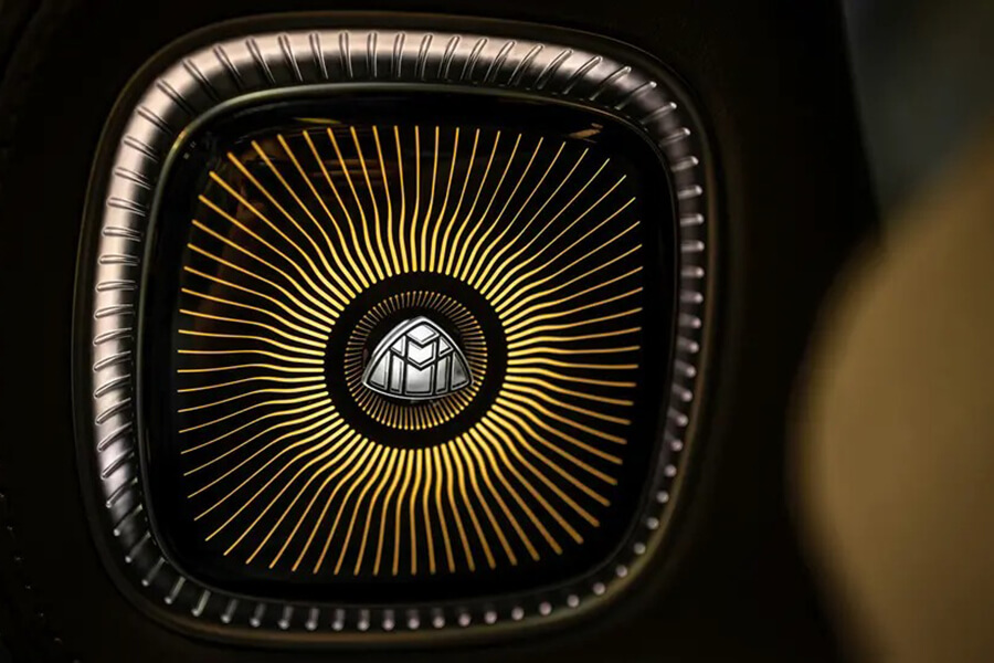 Mercedes-Maybach EQS SUV 配有特殊的車室氛圍燈,無論照明亮度、大小、位置均可以按照使用者喜好而展開設定;此外,標配的主動環景式內裝照明,共計有 253 個獨立控制 LED 發光單元與 64 種顏色選擇(包括品牌專屬白玫瑰金、以及紫水晶光暈),搭配車頂燈條,完善提供最獨特的光影饗宴。歸功於電動車平台,讓後座的中央扶手得以簍空懸浮,巧妙與前座的中央扶手相連,不僅視覺上更加洗練,更多出了些許膝部空間,再加上地毯上的投射廠徽巧思,如此細膩的細節堆疊,盡顯頭等艙般的尊榮。