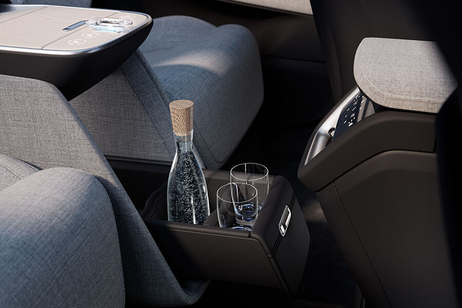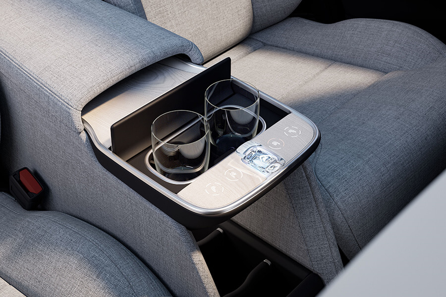 那這位完美的好傢伙有甚麼好料?除了二三排座椅背兩張獨立座位所取代,中央則由造型優雅的中控台所分隔開來。中控台後方―也就是兩張椅背之間其實也藏有玄機:把此處木製面板打開,就能看到裡頭的冰箱。