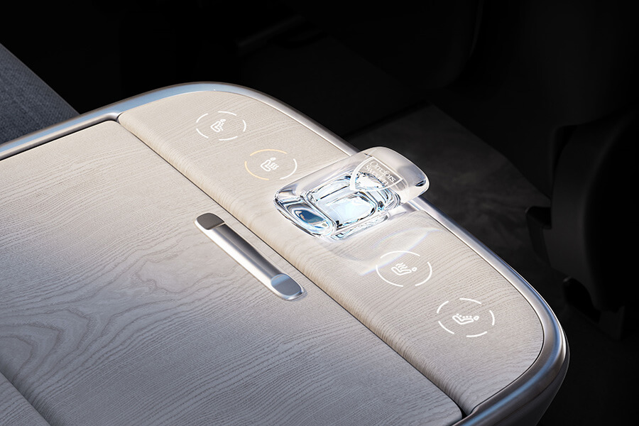 中控台前端同樣有木質飾面,只不過此處不只是裝飾用,而可以在上頭看到整合其中的觸控按鍵,可以藉此調整座椅的加熱及按摩功能。中央剔透圓潤的水晶則是車室香氛的控制開關,可以在車內配合氣氛照明散發三種不同氣味。