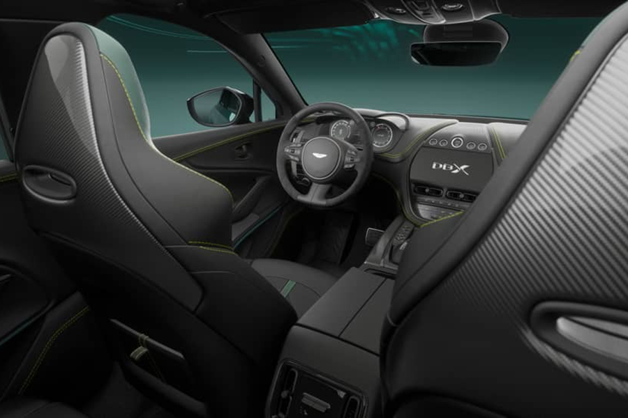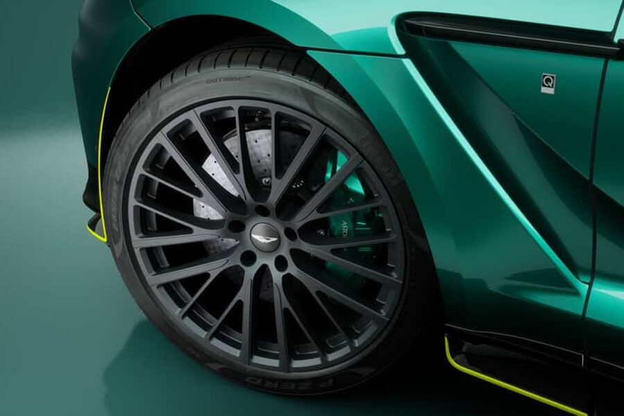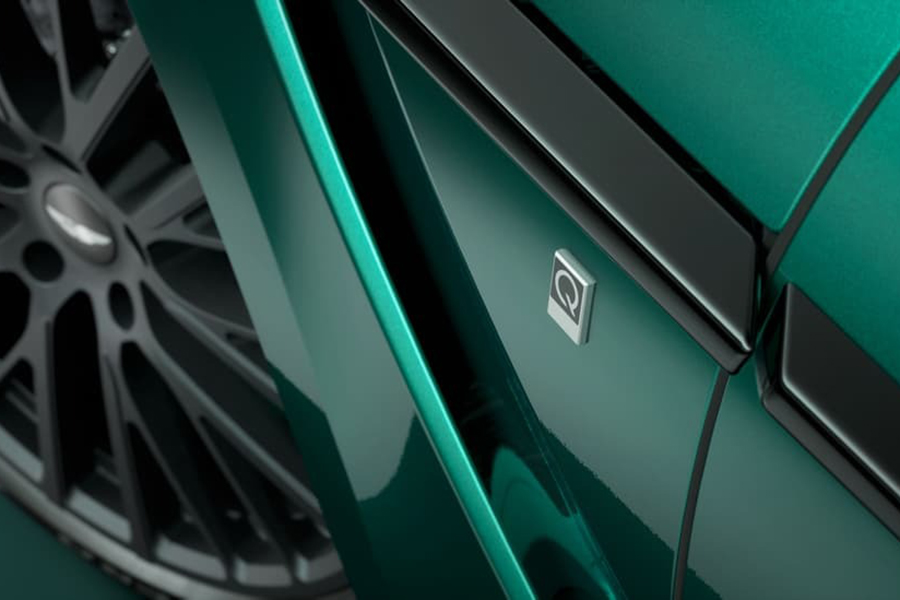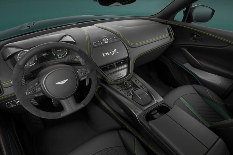 既然談到比賽,Aston Martin為DBX707 AMR23匹配了一層所謂”Podium Green”的烤漆、綠色塗裝卡鉗,以及翼片上的”Q by Aston Martin”徽章(是的,這些改動升級內容全由Q部門所一手策畫),以及各式額外碳纖維套件。
