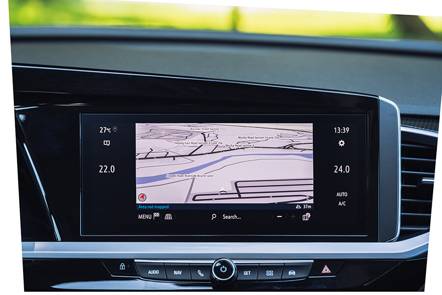 車艙內也大部分都是讓人不陌生的安排,但這個不陌生有兩個部分。第一當然是與Mokka有一定雷同度的控台,有一個基於雙螢幕圍繞駕駛的橫向主架構,不過整體曲度沒有Mokka那麼傾向駕駛側,平整的角度想必也是為了家庭用戶會有不同人員操作的考慮,而12吋數位儀表搭配10吋中控螢幕的安排也非常合乎目前消費市場對於螢幕尺寸的偏好,但有點算是廠方話術的地方是這套中控螢幕雖是號稱10吋寬螢幕的感受,但實際可操作變化的顯示畫面是中央等同一般約8吋的面積,兩側則是像家用數位時鐘的固定顯示介面,並非能連動顯示,同時全英文主機附上導航圖資,但我想實際使用性極低,環景360度顯影的立意絕佳,但媲美240p的解析度確實讓我原地傻笑了一番,不過那套與3008相同的排檔介面是第二個讓車艙顯得有趣的熟悉點,算是這個樸實車艙裡相對的特色記憶點。另外擁有護脊認證的座椅採用手動混電動的雙重機制,整車有很多東西都可以感受到廠方對於配備堆疊的用心,但也只能說母廠所選用的配備本身等級與搭配哲學和目前同級品牌確實有一定的落差,最後呈現到我們面前時,就有些說不出的尷尬,但要說不好用嗎?到也不會,但確實有些特有的邏輯要學習就是了。