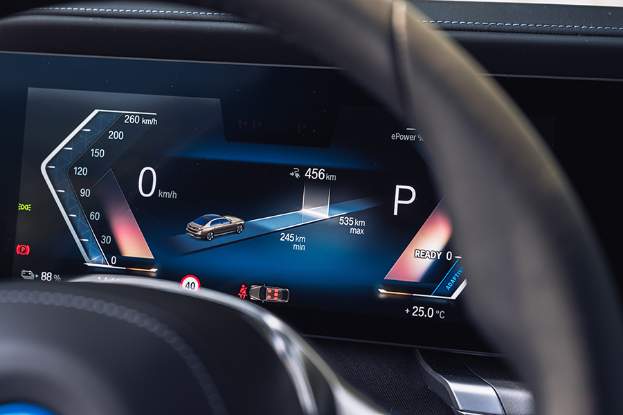 取車時電力未到百分百,但儀錶上超過五百公里的可行駛里程還有近期開純電車長途旅行的經驗,讓焦慮二字完全在我腦海中直接刪除,但必要的事項還是不能省略,簡單說一下跟電有關的數字,i7 xDrive60最長續航距離可達591~625公里(WLTP),主要關鍵是搭載105.7kWh的大容量鋰電池,且厚度只有110mm而能夠放在地板下而不占車艙空間,低重心對操控也能帶來幫助。充電效能以家用7.4kW裝置,大約兩個半小時可獲得行駛100公里的電力,若使用195kW直流電快充更只需34分鐘即可讓電力從10%來到80%,就算司機待命時一直在車上吹冷氣,老闆們也無需顧慮電的問題。