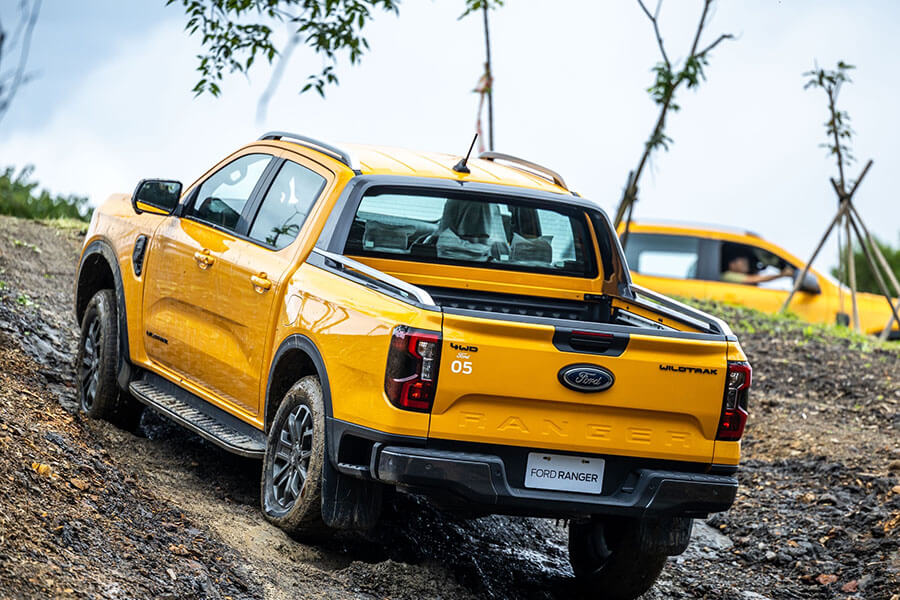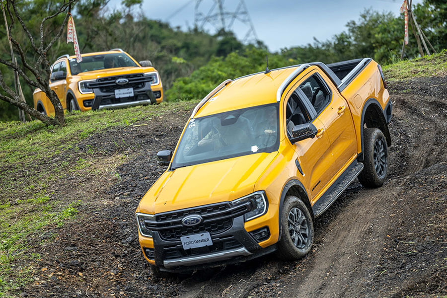Ford Ranger這次輪距寬度較上一代車型增加了60mm,前輪往前移動50mm使前懸縮短,進一步提升車輛越野能力及車輛穩定性,並連帶增加整體置物平台的寬度。其具備30˚進入角/21˚穿越角/25.6˚離去角,以及800mm最大涉水深度的優異越野能力。受惠於XLT車型配備的Part Time 4WD(高速二驅2H/高速四驅4H/低速四驅4L),以及Wildtrak車型升級配置的Advanced 4WD(智慧四驅4A)及電子式後軸差速器鎖定等科技,使得Ranger可因應道路狀況提供最佳化的四輪循跡性,並在沙地或濕滑等惡劣路況帶來優異的脫困能力,引領車主以高度駕馭信心探詢精彩生活。