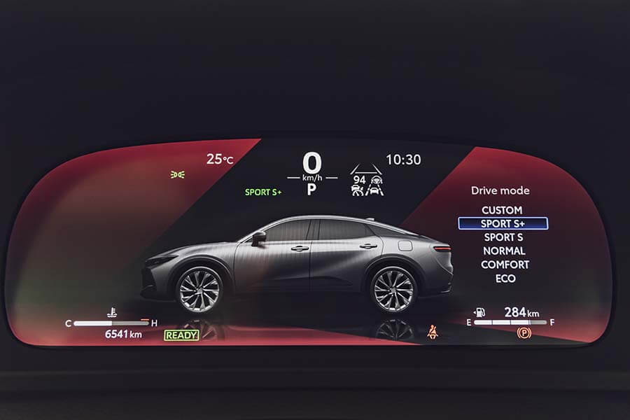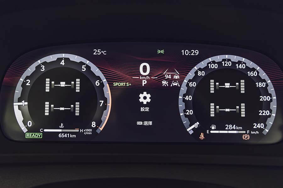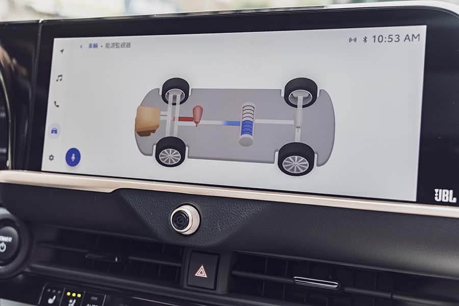 不瞞各位,前一次開Crown貴族版是失望的,2.5升油電複合動力及前驅底盤的表現跟前衛外貌出現極大反差,小小聲的說:開起來就像換了殼的Camry,不過視線一轉到皇家版,2.4升渦輪增壓加上油電複合動力,再搭配eAxle電子四驅,加上技術解說的影片更瞬間激起我的求知慾。從顯而易見的地方切入吧,一上車整個身體的熱氣就被三段全開的通風座椅給吸走,整個人神清氣爽,再來就是儀錶板內的eAxle驅動變化,讓我先來快速解說這套電子四驅的架構,引擎只負責驅動前輪,後輪由一套雙極鎳氫電池驅動的80匹馬力馬達負責,當然前輪在引擎之外還有一具馬力83匹的馬達,讓這套eAxle可執行前後100:0~20:80的驅動力分配,雖然圖形的刻度變化無法明確看出驅動比值,但過去你有見過這樣的Toyota嗎?
