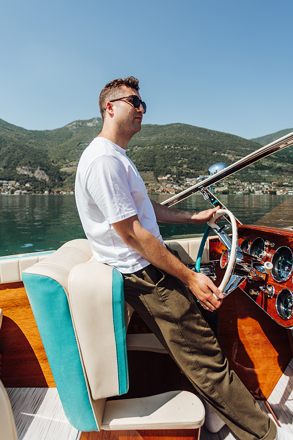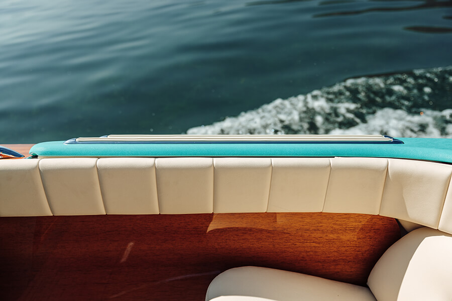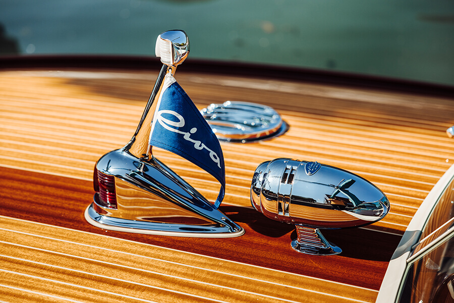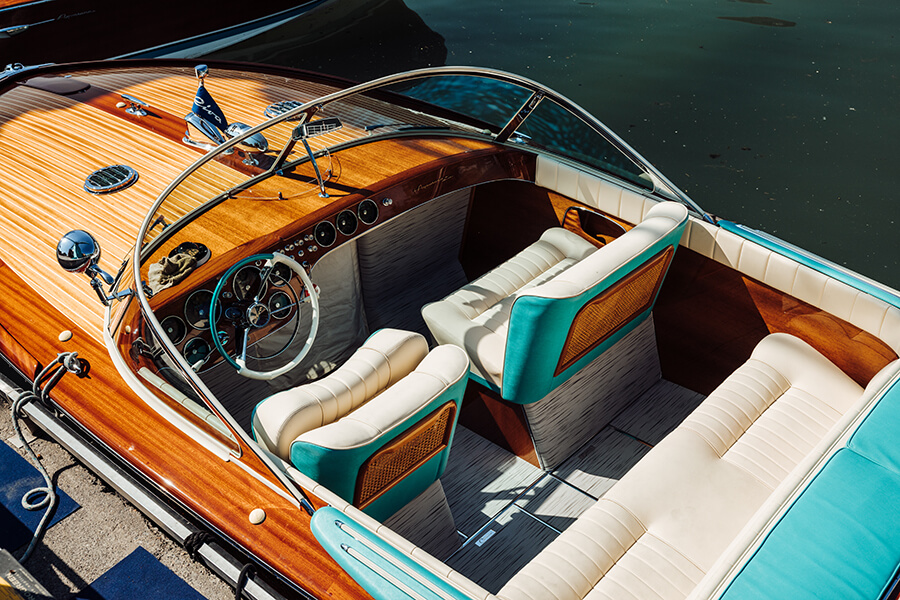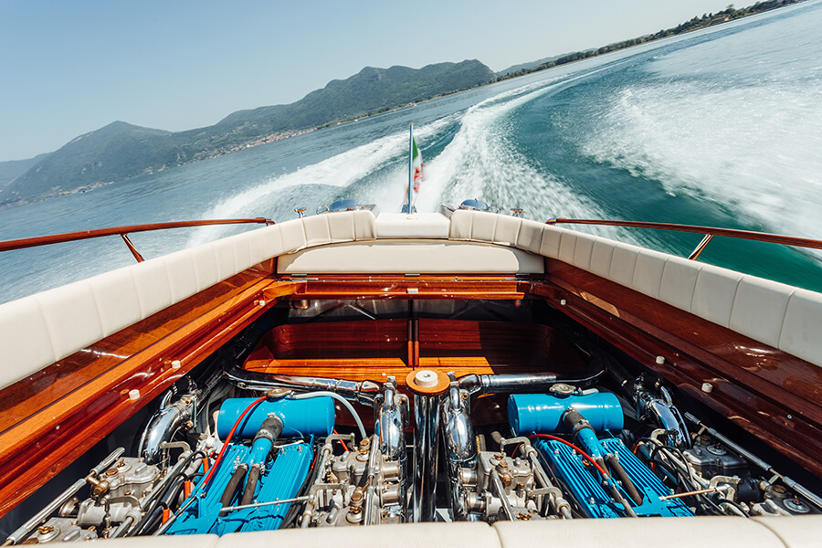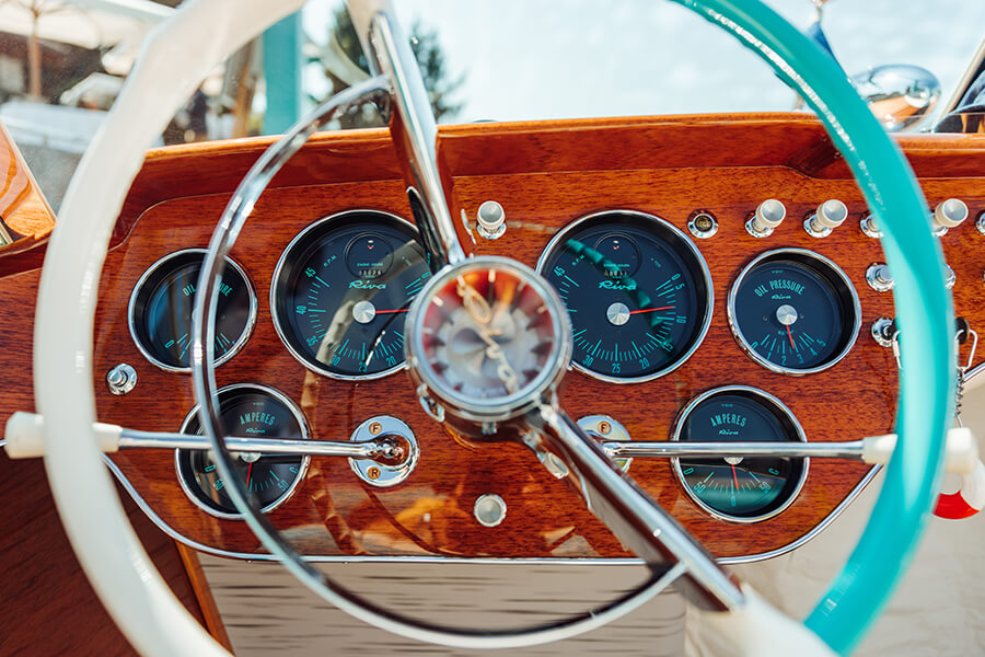 鑑於這艘翻新得美輪美奐的Riva快艇價值超乎想像,新任船主又叼著雪茄密切觀察現場情況,我斷定最好還是拜託船長經驗比較豐富的人帶領我們離開船來船往的Bellini Nautica船廠。看著Giuseppe Pievani伸手一撥方向盤後邊打磨得光可鑑人的操縱桿進入開船狀態,然後逐點推動兩支手動油門控制桿進入最低推力的位置(兩副V12,當然有兩支油門控制桿),我但覺Riva的art deco船艙果然天下無雙。Ferruccio訂造的這一艘現已採用「穿鞋勿進」的裝潢,白色真皮躺椅的背部以藤蔑編織而成,船上每一處都收拾得光潔明亮,正午陽光下不戴太陽眼鏡的話根本無法看清為數眾多的儀錶。
