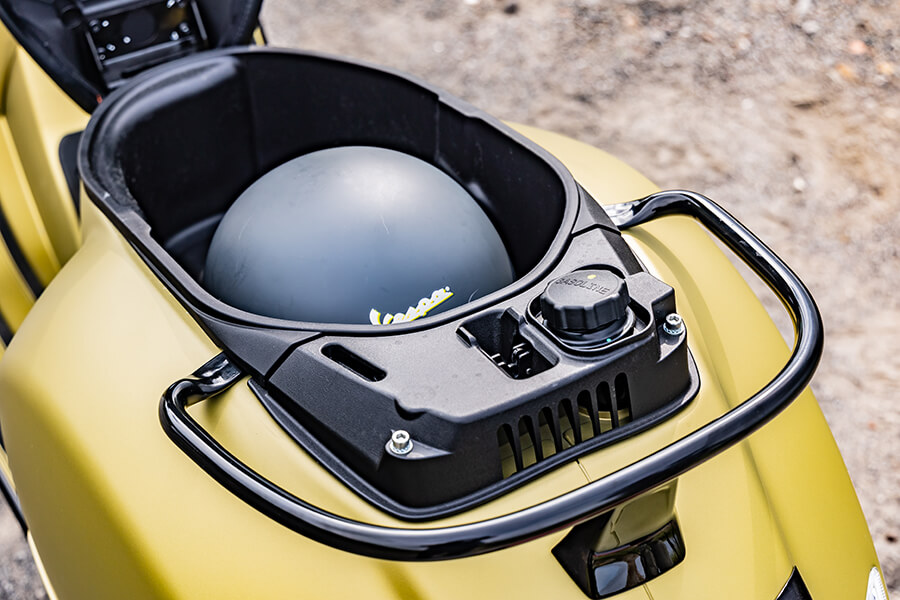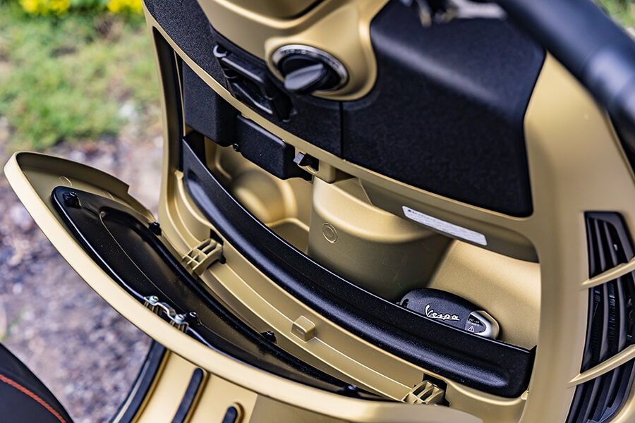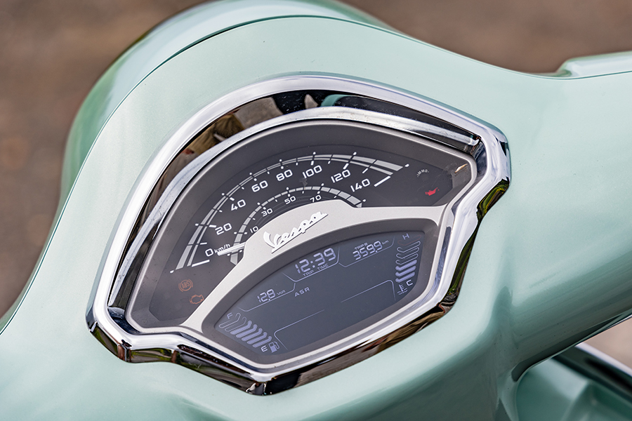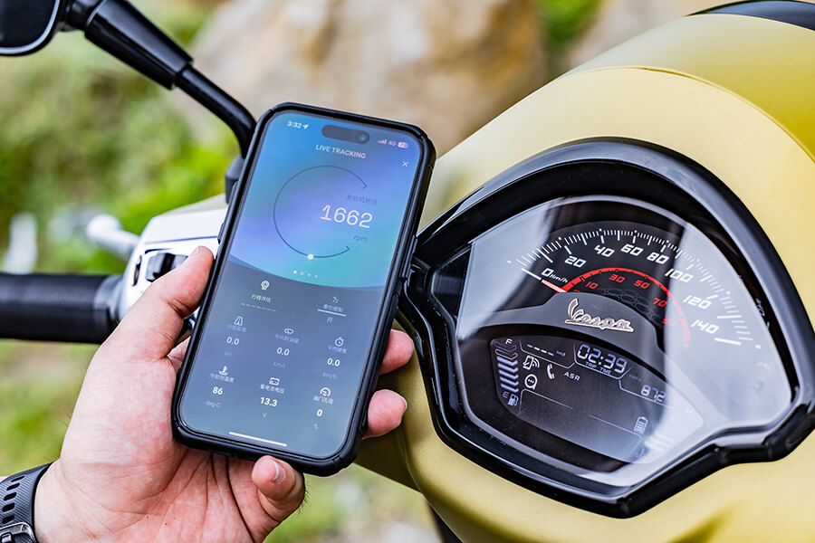 不過這次最令我感興趣的,倒是位在前方的扇型儀表。疑,這不是Vespa再尋常不過的元素嗎?請再把視線放低一點點,除了上方指針儀表根據車型不同有著恰到好處的儀表設計外,下方其實結合了負顯LCD螢幕顯示各項資訊;同時Classic車型可以透過選配增加Vespa MIA 多媒體平台系統與手機連結,藉此播放音樂、接收訊息與通話的提醒等,至於Super Sport車型更直接將MIA列為標配,與手機連接的app裡頭還能顯示及時車輛參數、停車位置、保養提醒等等資訊功能等。雖然顯示通知的欄位僅能顯示1-2行文字,不過整體設計算是兼顧了古典美與科技味,操作起來很是有種Cyberpunk的衝突感,相當新鮮吶。