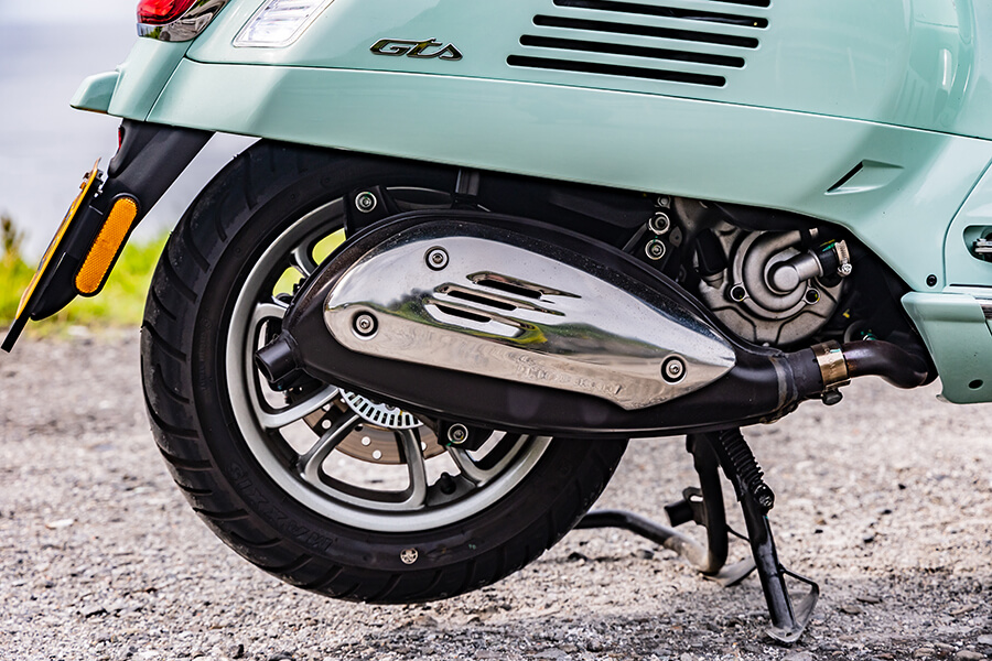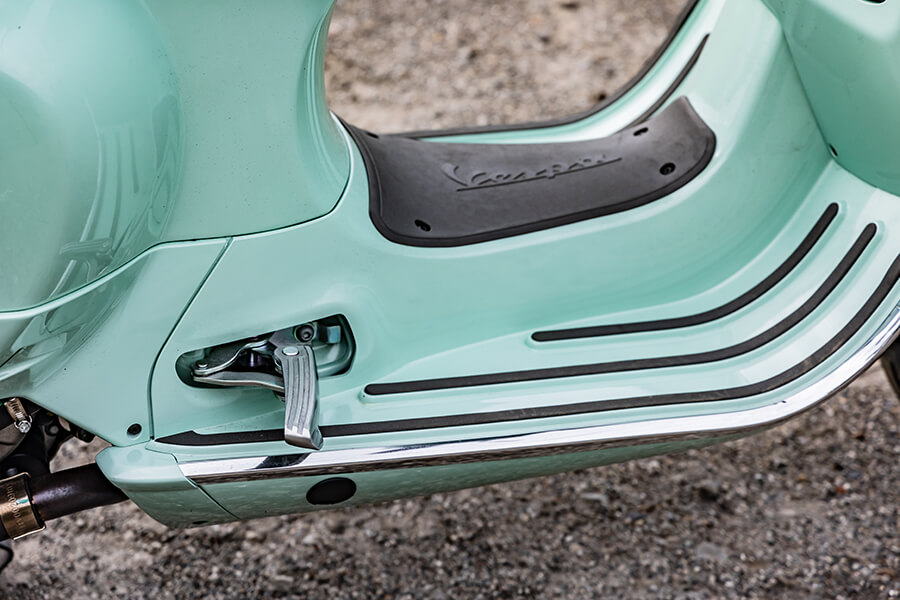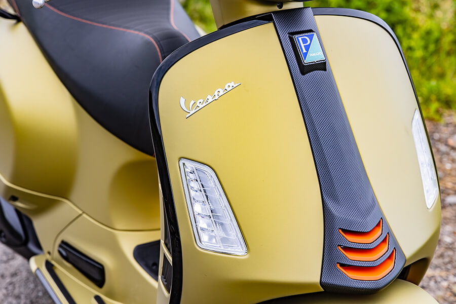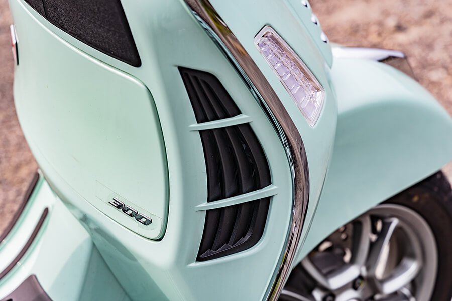 本日主角其實是一對GTS 300,兩車分屬”Classic”以及”Super Sport”版本。首先吸引我目光的是那台GTS 300 Classic,薄荷綠的車身配上為雋永線條描邊的閃亮鍍鉻件,除了材質與用色的確能帶出昔日氛圍外,這襲清爽脫俗的外衣在氣溫突破三十度的夏日,的確能收降低心理溫度之效;再看到另一頭,GTS 300 Super Sport通體披覆著消光橄欖綠,隨著光影與車身線條的改變不斷呈現多層次的光澤,加上碳纖維壓紋喇叭蓋與黑、亮橘相間的點綴著實內斂中帶有悶騷,簡直難以不讓過往行人視線在它身上多打轉兩眼。