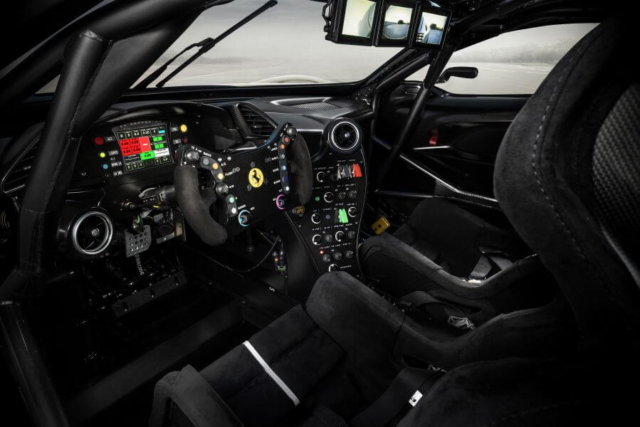 新車座艙採用精簡的設計理念,與Ferrari 488 GT3 Evo 2020賽車的內裝造型相似,僅乘客座側面的門板和儀錶板飾板有所不同。此外,Ferrari KC23的專屬座椅採用Alcantara®材質,並配上電焊工藝的標誌,賦予座艙的優雅韻味,與外觀風格完美呼應。新車配備攝影鏡頭,提供優異的後方視野。同時,取消傳統的後視鏡後,車身側翼線條更顯簡潔流暢,並有助於提升車輛的空氣力學性能。