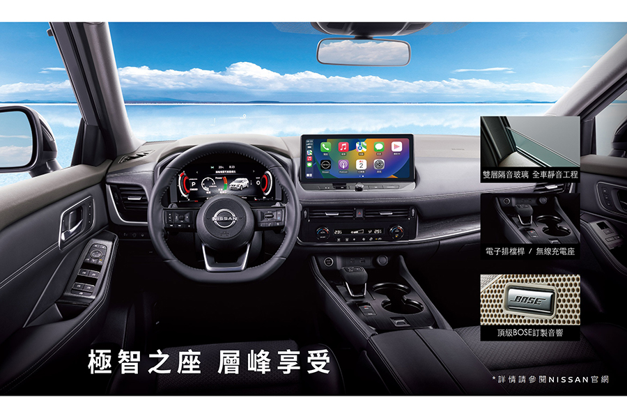NISSAN X-TRAIL輕油電前擋與雙前座採用雙層隔音玻璃,搭配全車靜音工程及防火牆三層隔音材質導入,創造出靜謐車室空間,搭配BOSE Premium Sound的高音質體驗,讓開車成為一種享受。X-TRAIL 輕油電透過數位座艙中「12.3吋數位儀錶板」、「12.3吋數位影音主機」與「10.8吋數位抬頭顯示器」三大螢幕,打造車室嶄新科技氛圍,讓X-TRAIL 輕油電成為真正符合顧客期待之「新世代」休旅。