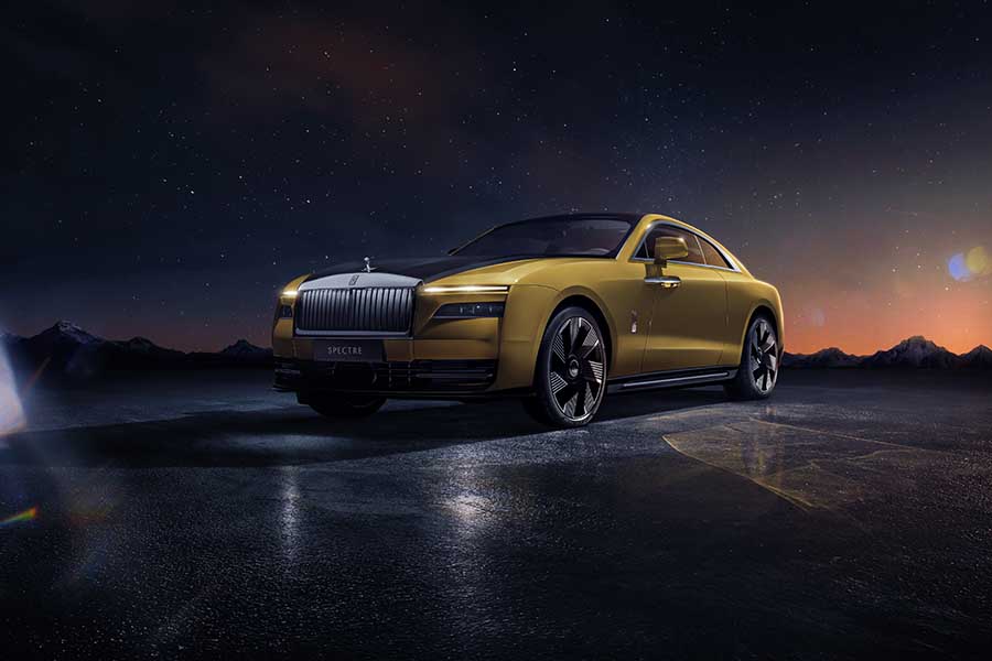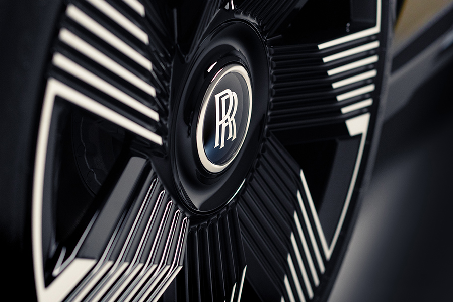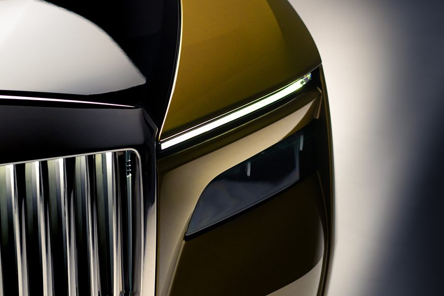 除了動靜要像勞斯萊斯,Spectre的內外觀感也得像是勞斯萊斯。車頭當然少不了希臘神殿大護罩和吉祥物Spirit of Ecstasy這些經典特徵,但某些方面卻與勞斯萊斯常用的臉譜頗為不同。這個神殿是勞斯萊斯歷來最寬的尺寸,但基本上不會通風透氣,因為車上沒有V12需要冷卻。車頭設計的優先考慮反而是降低湍流阻力,柵條頂部更藏有向下照射的燈,令夜間出巡更有氣派。與此同時,護罩頂端屹立著一個重新演繹的Eleanor Thornton,身軀更加傾向前方作破風之狀。護罩兩旁則設有上一次見於Phantom Coupe的分割式頭燈。頭燈上半截是恆亮日行燈,下方主燈藏在熏黑燈罩後面,給人一種若隱若現的神秘感。