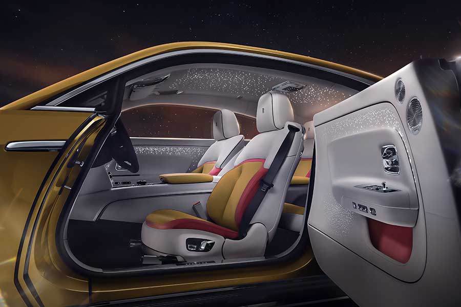 圖中所見的Spectre,裝潢相當非凡吧?座椅採用了勞斯萊斯所謂的「翻領」——一幅方便買家玩色彩對對碰的真皮。車門可以選用Starlight特色照明,即是那些發光的小光點呀。光點總共有4,796個,有心人不妨自己數一數。不好這一套的話亦可以選用大面積的木鑲板。喔,乘客那邊的控台也有星光鑲板與星光車門成雙成對呢。