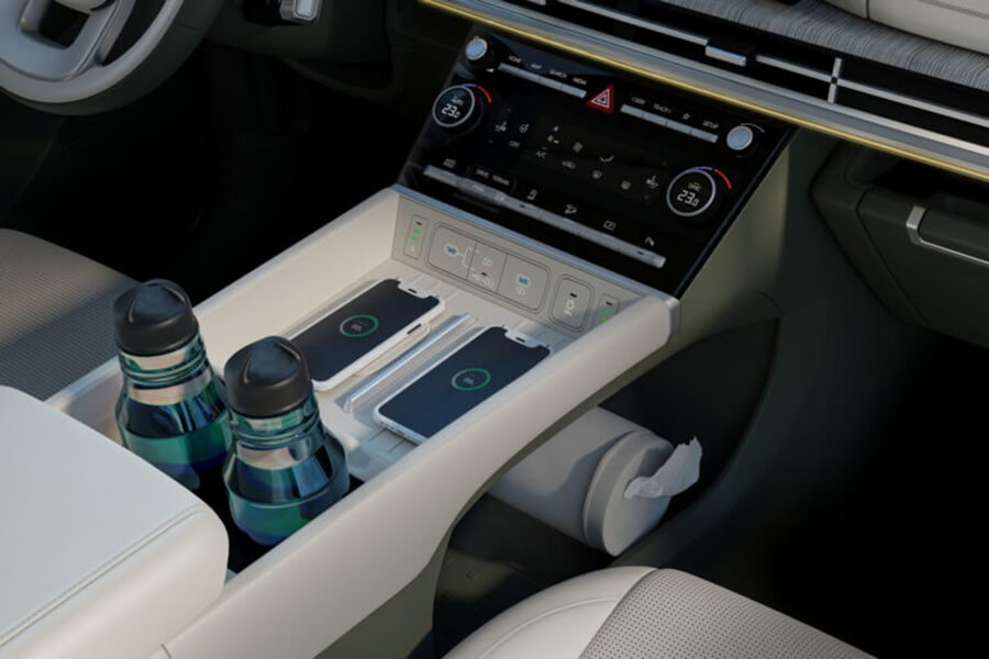在車室前方有著12.3吋數位儀表及娛樂系統,儀表及出風口的外型輪廓也呼應車外的H型設計,在6.6吋獨立的恆溫空調螢幕下方有著雙USB-C連接埠、雙無線充電系統等,同時UV-C 消毒托盤亦方便對手機、錢包等隨車物品進行消毒。