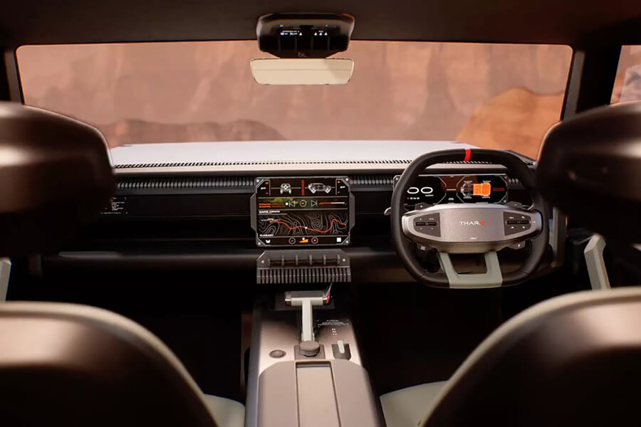 除了野味十足的外觀,Thar.e藉由懸吊、高扁平比全地形胎及輪圈的搭配,使離地間隙高達300mm,確保在險惡地形下也能讓車底的電池組與地面保持距離。除此之外前後璇的長度也被盡可能地縮短,為此Mahindra也聲稱此車具有一流地越野三角及涉水能力。