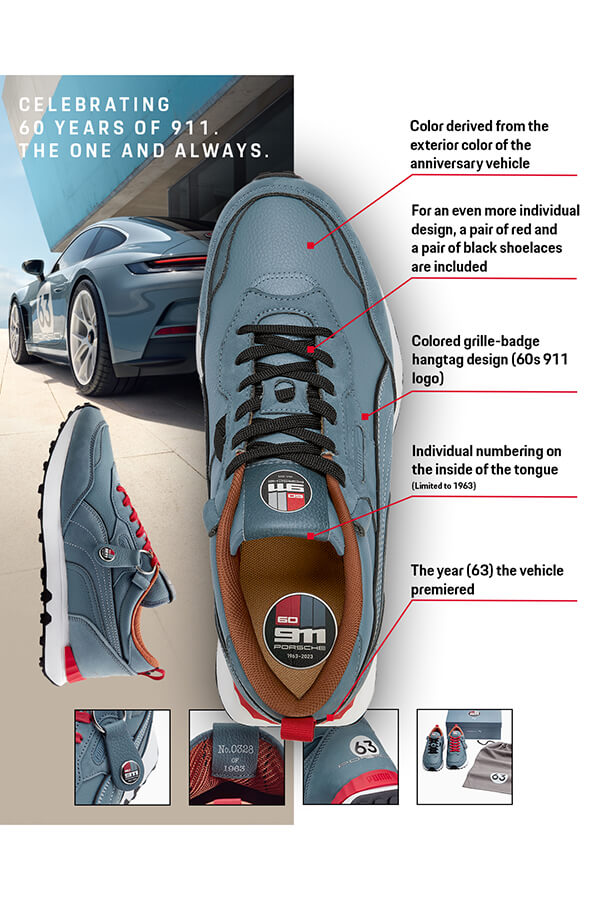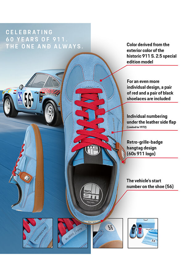 首先有一款靈感源自1972年Porsche 911 S 2.5的retro鞋款,除了窄且扁平的輪廓,淡藍色的絨面革材質鞋身與光滑的皮革襯裏間還有帶紅色縫線的鞋舌,鞋舌上還印有保時捷911六十周年標誌,造型仿照911 S/T上的格柵徽章,同樣設計也出現在鞋子上的棕色皮革吊牌上;原車尾部的56號圓形車號則出現在後跟的相對位置上。這款Retro鞋款僅將生產1972雙,每雙都將有單獨的流水編號。