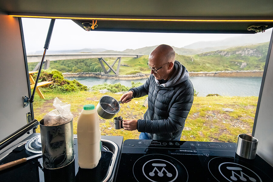 於是我在Kylesku用平底鍋為攝影師Jonny和錄影師James煎了一些培根當早餐,因為我帶來的煎鍋並不適用於這些電磁爐。直到趁著下雨喝了一大壼茶後,我們才意識到還有許多拍攝工作有待完成。