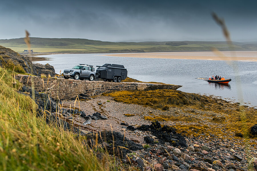關於前一個問題,我們已經成功取得軍方批准進入該區,後一個問題就比較麻煩了。話說靶場內原來有一條12哩長的道路,問題是這條路兩頭不對接,西北一端只能到達怒海角燈塔,東南一端的盡頭則是一片汪洋大海。這條道路之有無其實無關宏旨,因為Defender和Bruder的突破能力足以橫越12哩泥炭沼澤和遍地石礫。但寬有一哩的德內斯灣(Kyle of Durness)就比較棘手了,Bruder縱有浮力也會好生為難(沒錯,Bruder真的會浮喔)。當地確有一艘渡船接載那些習慣穿著防水外套的發燒友橫渡海灣,可是考慮到渡船只是裝有小巧舷外機的小艇,要它送我們過海,怎模看都是鴨子馱著大河馬。