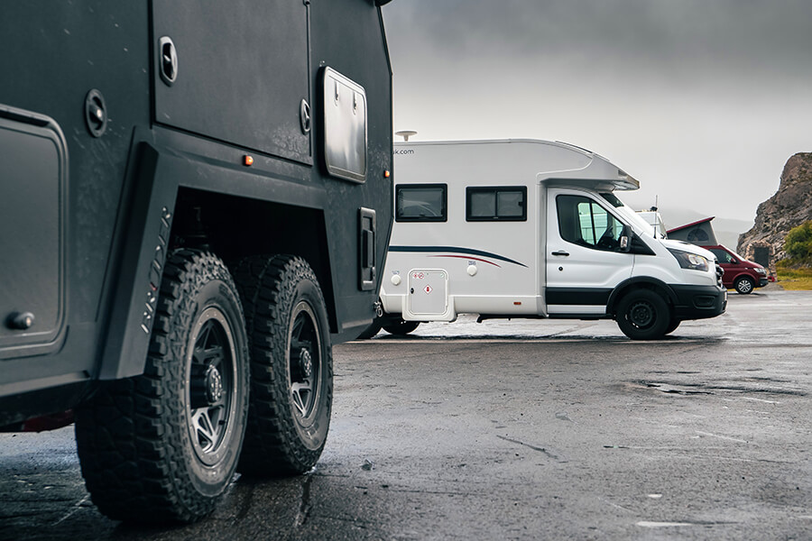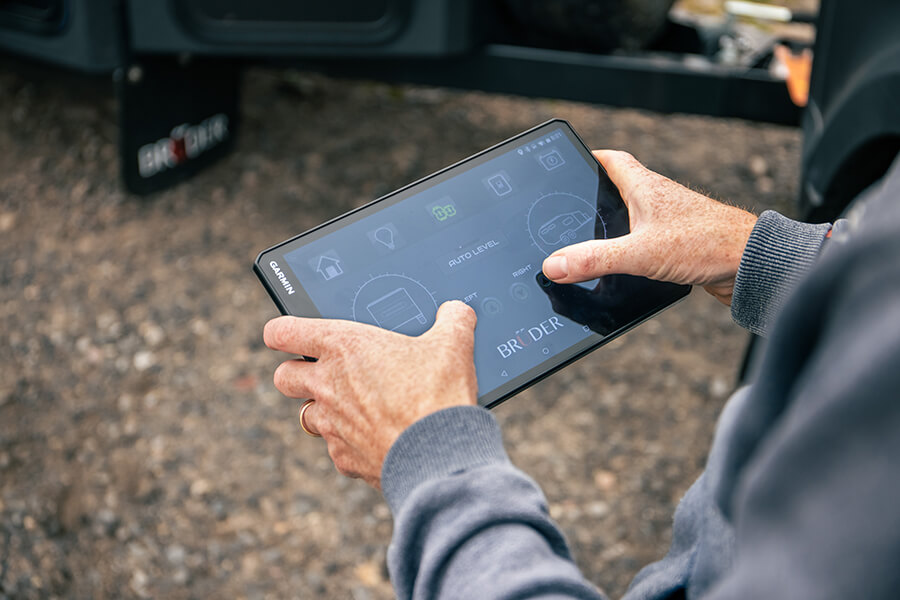 與此同時,黑武士的露營拖車卻一切如常。我知道一切既往,因為EXP-6附有一個無線遙控平板,方便你在車上控制拖車那邊的設備,水位、暖氣、照明、太陽能充電、電池狀況、車上鏡頭都可以任君遙控,我甚至可以手動控制左右兩邊離地距好讓拖車傾側過彎。