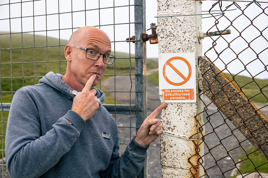 最後我們和地主總算達成了協議。根據協議,我們的汽車可以通過沙灘,拖車卻免談,原因且容我稍後道來。卸下Bruder時,我切切實實感覺到Defender如釋重負地聳了聳肩,得以輕鬆快活地橫越白金色沙灘。坦白說,我相當慶幸自己沒有拖著七公尺長的粗重卡車越過這片軟沙。最出乎意料是來到沙灘盡頭時,居然發現一條神神秘秘埋藏在沙丘之間的柏油路。柏油路在沙灘上迂迴曲折地伸延了一兩哩後,便向上翻過懸崖和青葱山坡,一直帶領我們來到靶場觀測站。問題是瞭望塔上雖有燈光,站外鐵閘卻上了鎖,反覆敲門也沒有人應門。