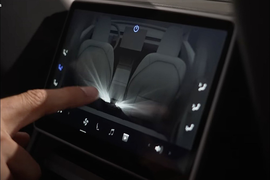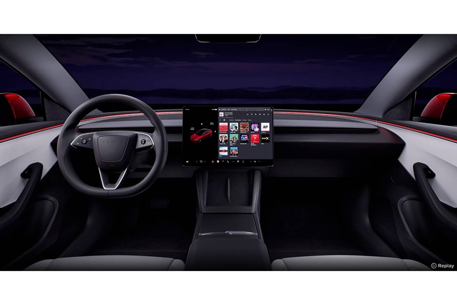 車內則以鋁材及更新的織物表面鋪陳車內,配合環境照明系統。除此之外新款Model 3還用上隔音玻璃與其他隔音用料,後排也增加了用以控制空調及娛樂系統的8吋螢幕,前方的15.4吋螢幕邊框也設計得更窄。最後原先在方向機柱上的撥桿也改為與Model S/X同樣,透過方向盤面的按鈕控制。娛樂方面LR版本具有17具揚聲器,較現行款多出三個;後驅版本則有九具揚聲器。此外麥克風也經過升級以提升通話品質。