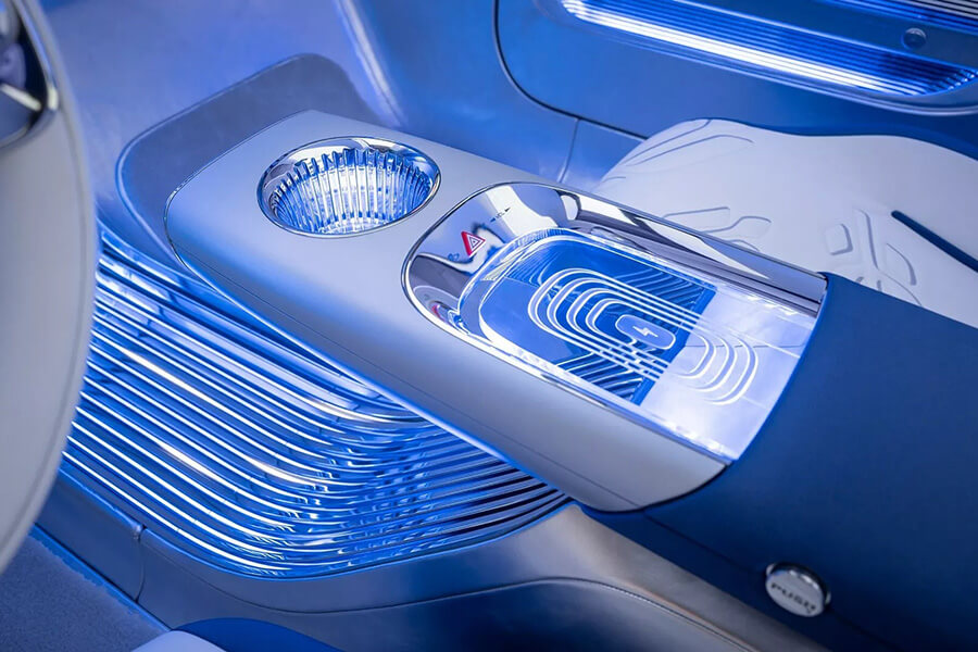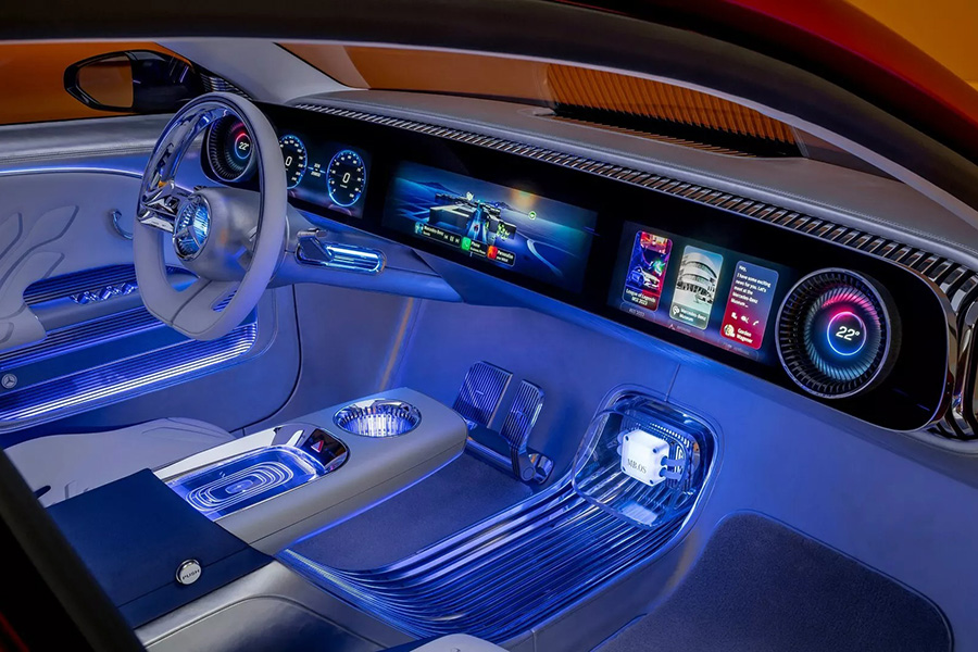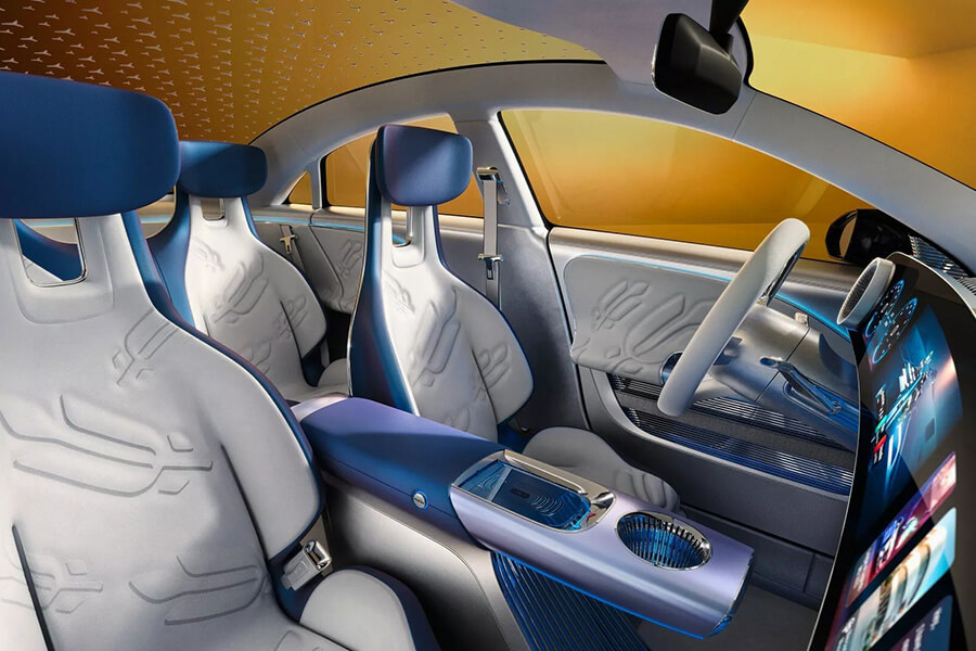 內裝方面,以寬敞而通透的空間,結合先進科技將汽車設計逐漸帶進數位化的未來,定調下一世代設計語彙。未來感十足的座艙科技,採用了高效 mini-LED技術及沉浸式3D圖形的MBUX Superscreen,其纖細而流暢的線條延伸至整個駕駛艙。環繞車室的光帶象徵著神經傳輸信號,整體車室設計架構詮釋了數據流動的概念,動態具體呈現車輛與使用者之間的互動。為了強調全新中控台的設計,前座車門內裝採用特殊的內凹曲線,使中控台像是懸浮於車門前端,彷彿優雅的風帆在使用幾何設計的車門把手周圍飄揚,和諧地交織成車門扶手。車門控制面板與把手周圍的內裝,與座椅同樣採用水晶白的 Nappa 皮革包覆,凸顯輕盈外型與觸感;以及還鑲有 Mercedes-Benz 經典的月桂環式樣,透過精湛的工藝,將品牌獨有的經典元素與未來豪華科技,建立了強烈的視覺連結。在車門底部的細節上,置物袋邊緣採用了生物編織技術原創者的高強度、經過認證的純植物性類絲綢面料,兼顧舒適與耐用度。