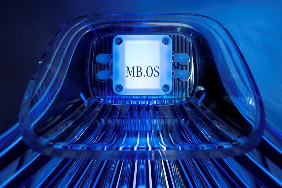 品牌對於未來的願景不斷在重新定義汽車,使它超越作為交通工具、助手或伴侶的角色。汽車在未來將成為娛樂或遊戲中心、工作空間、放鬆身心的私人空間,甚至是伺服器中心與能源網路的一部分―融入生活成為不可或缺的存在。為了實現此一願景,Mercedes-Benz 充分運用當前技術潛力與未來軟體創新,開發了全新自有 MB.OS 作業系統。這種專用的晶片到雲端架構(chip-to-cloud)將會是公司新的發展方向,在幕後隱性地為未來車輛提供大量可供開發的潛力。MB.OS 的核心是軟硬體的解耦,讓軟體開發更快速、適應力更強大。這有助於車輛不斷創新,為客戶提供更好的產品。與強大的合作夥伴密切合作,內部開發的專有系統為公司提供了創新的自由度和靈活性,以及快速有效的行動能力。例如來自策略合作夥伴 NVIDIA 的高性能水冷晶片,這種強大的合作夥伴將有助於每一台 MMA 平台所打造的車輛都配備超級電腦。MB.OS 使用最新一代的晶片與系統單晶片(SoCs),並透過高度先進的感應裝置與 Mercedes-Benz 智能雲端的支援,提供人工智能 (AI) 與機器學習 (machine learning) 的功能。