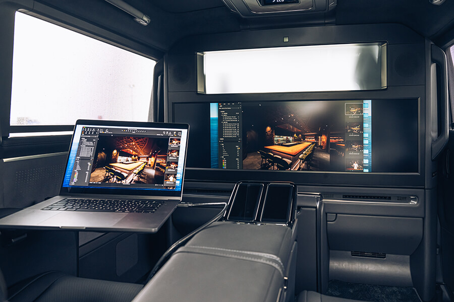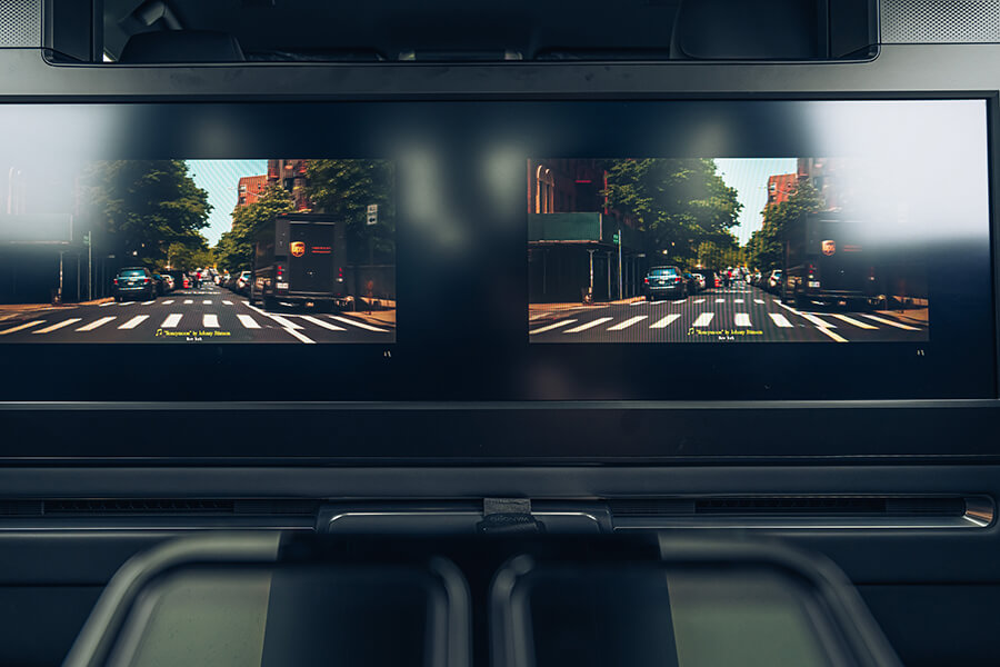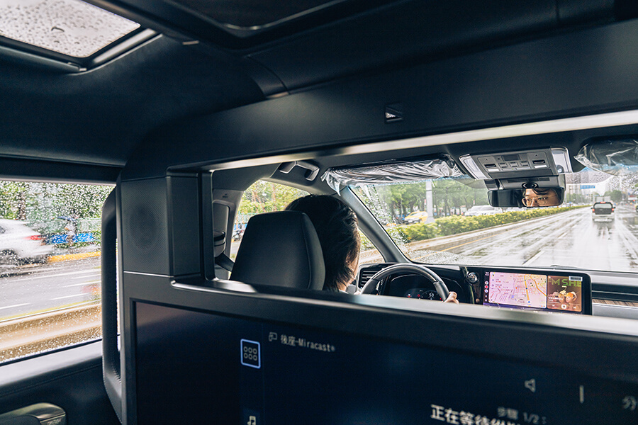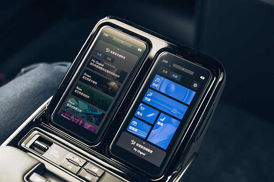 再來新的大螢幕一樣是用HDMI連接,可以選擇獨立顯示或分區雙螢幕,這些控制都可從座椅上的手機造型小平板來操作切換。但廠方也算是第一次設計這類控制系統,整套介面的操作上手度有點尷尬,總會發生找大項功能不難,改細項設定容易迷路的狀況。不過系統附上現在豪華車款很重視的氛圍營造功能,同樣設計了幾種能幫助調劑身心的模式,這些模式都會連動空調、座椅按摩或傾倒、音樂、以及車艙的明暗隱密度去調整,但實際體驗可能沒有歐陸旗艦房車那麼強烈,也是比較潛移默化的展演。
