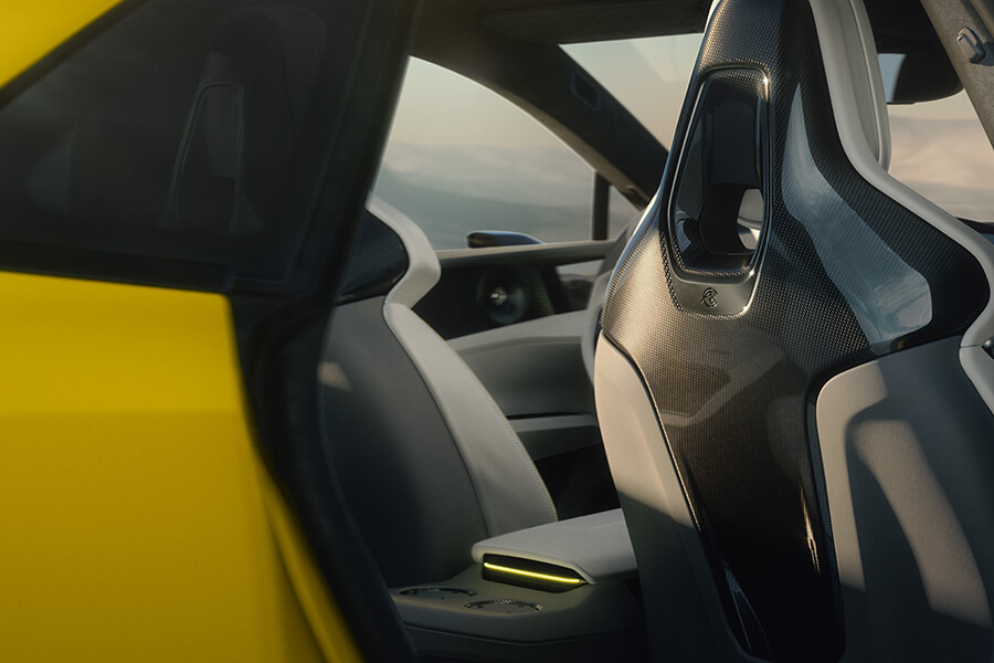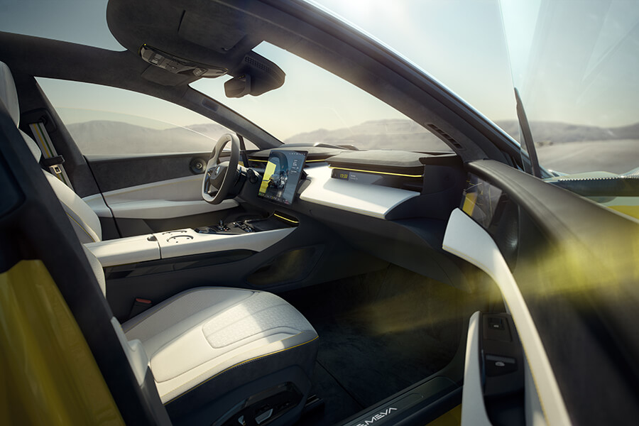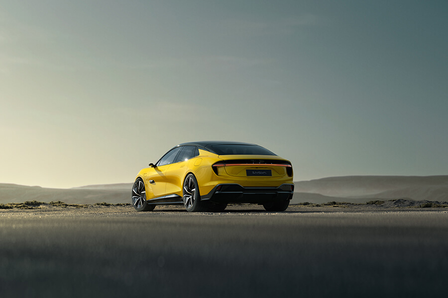 同時本車也將支援350kW的超高速充電,僅需5分鐘就可補進150公里里程,並在18分鐘完成80%的充電電量;另外本車將有非常先進的主動空力系統以及氣壓懸吊系統,車頭主動進氣壩將負責減阻與散熱的主要工作,車尾的雙層主動式尾翼則為下壓力來源,最高可提供215公斤的下壓力來穩定車輛,車頭也備有主動擾流翼在高速時負責提供車頭壓力,廠方也表示這套系統也將會提供Emeya非常出色的車頭轉向反應,來展現Lotus一貫精準的操駕風格。