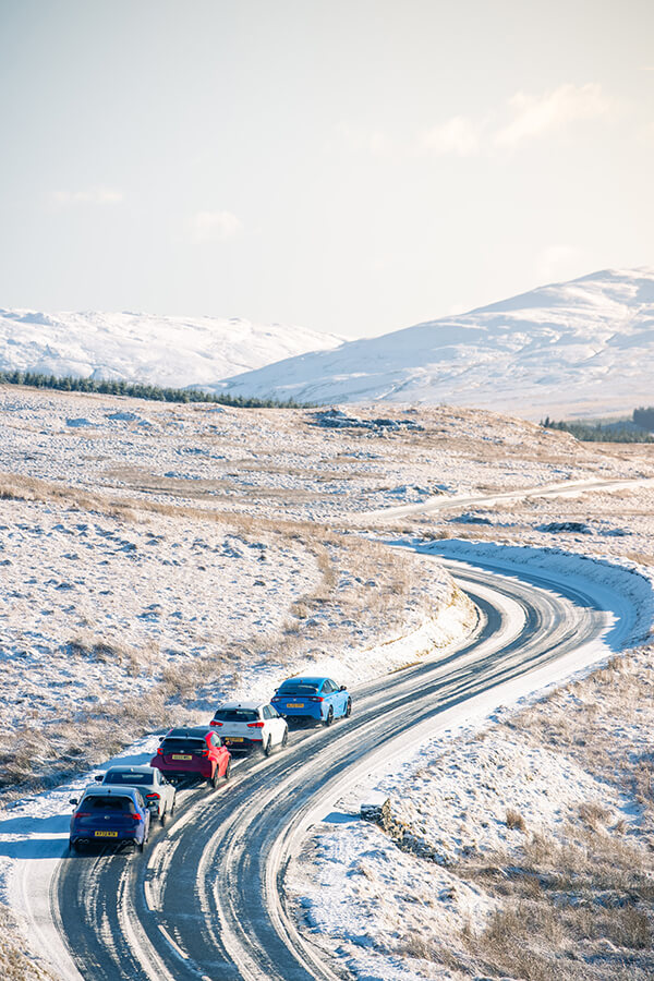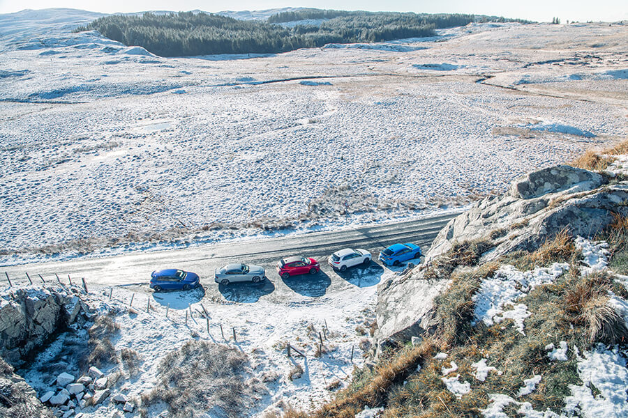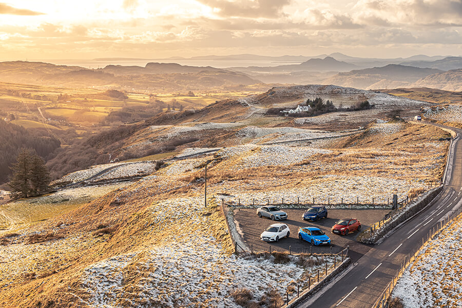 這一切不是很美好嗎?冬日輕撫著斯諾多尼亞的丘陵,光與影交織出恍如浮雕的效果。山谷中可見薄霧漂渺,較高處遍地鬆脆雪粉,樹葉上的白霜折射出彩虹樣的綜紛色彩。簡而言之,這是一個登高遠足清清腦袋抖擻精神的好日子。可是在這種日子設法勘破五部利用粗壯夏季輪胎努力在充沛動力與濕滑路面之間斡旋的出色汽車在動態性能上有何差別,就不是那麼妙了。所以這天早上我們會疊埋心水享受沿途風光,順其自然拍一些照片,等到下午和明天才在海拔較低的地方認真試招。一想到這,我簡直急不及待好想大開油門。