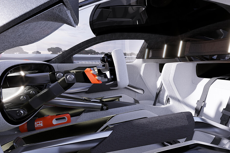 打開鍘刀式車門,Concept 20-23的車艙配有科幻味十足的白色桶椅、方形方向盤、少量開關及兩座踏板,除此之外便別無他物。此外車內也僅顯示最基本的行車資訊,以將駕駛以外的干擾降至最低。哇,在今日看起來是一個相當大膽的做法…