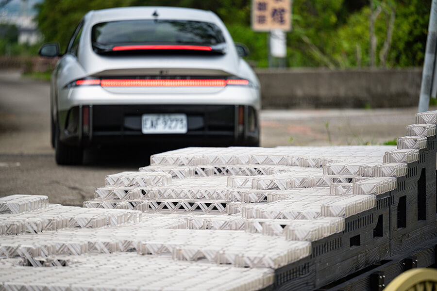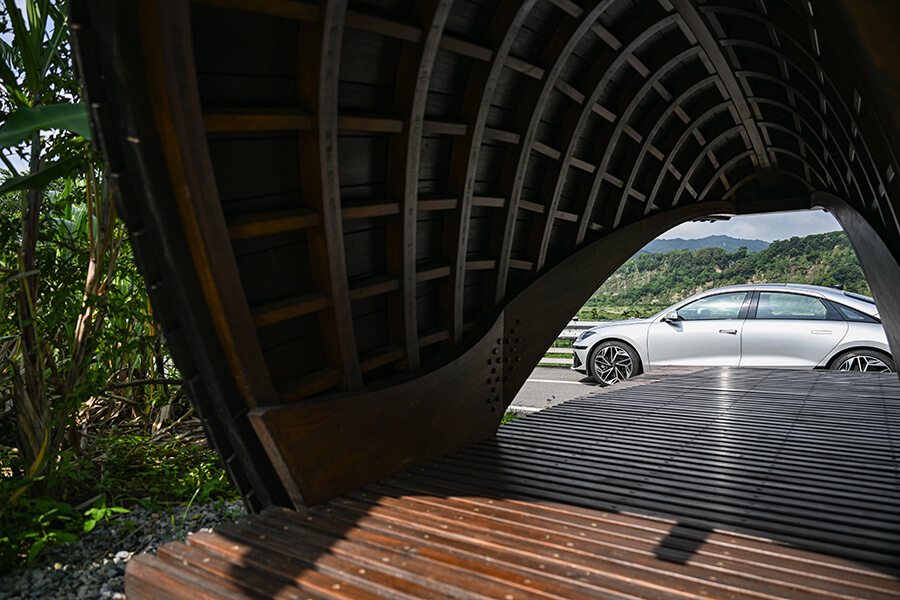 兩處公館鄉的藝術作品皆依附於當地的圳道之上,"野生.冶森.也之聲"結合自然景觀與文化產物,由居民共創的植物染、與刻上百草形貌的陶片在圳上、風中搖曳並叮噹作響,此時Ioniq 6流線的輪廓姿態配合這一幅景象,彷彿將無形的自然流動具象化;而我輩則偏好流連在以3D列印技術建構的"Riving Room"旁,此時這部Hyundai則又好似來自8-bit世界,該藝術品的塊狀結構與此車隨處可見的像素設計簡直如出一轍,忍不住就陷進精神時光屋,手機掏出來拍到差點忘了時間…
