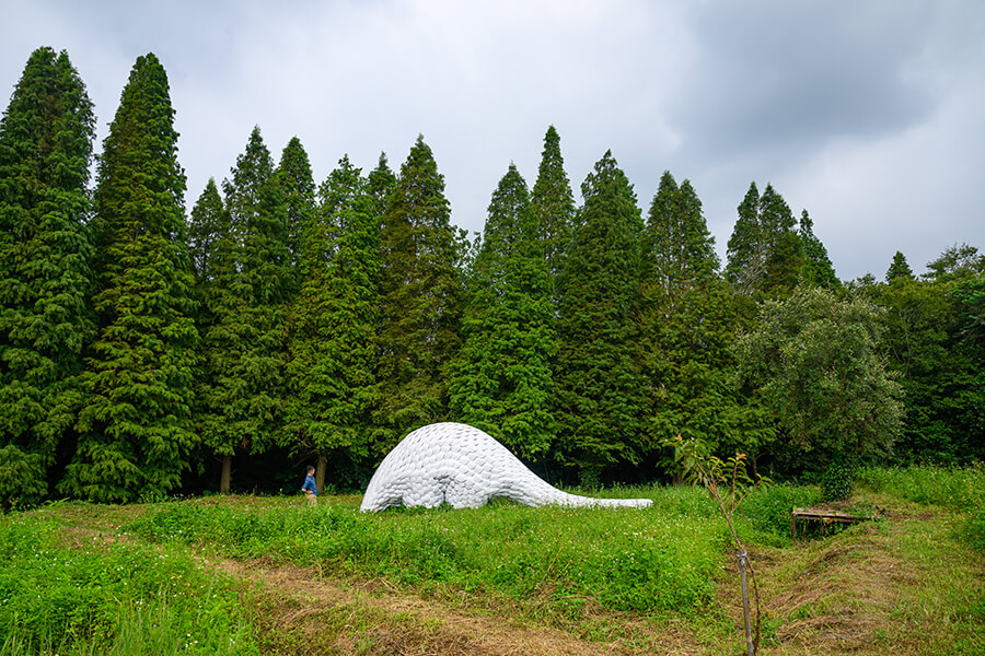 往北約40分鐘車程的大窩一帶,在過去重疊了客家與泰雅族群的生活足跡,在此的兩座地景藝術:"編織記憶"、"生命的鑿痕"分別用白色棉線與千片木材形塑出屋棚樣貌,前者透過由純白逐漸褪色、融入環境體現不同族群、環境共一家的精神;建於河谷溪畔的後者則以層層木片堆疊出流動感,表彰"心向自然"的萬物本性。兩處地點除了與Ioniq 6合拍起來著實十足清新脫俗外,我也很高興此行是以對這片山林干擾最少的姿態,像是躡手躡腳般小心翼翼地靜靜前來、再不著痕跡地默默離去,此車在精神上也算是與展物倆相互輝映吧。