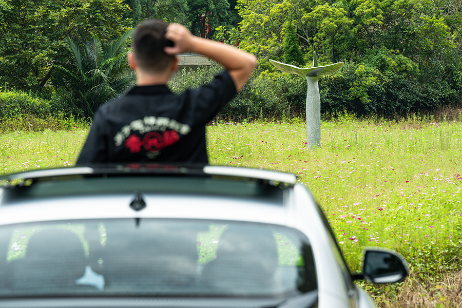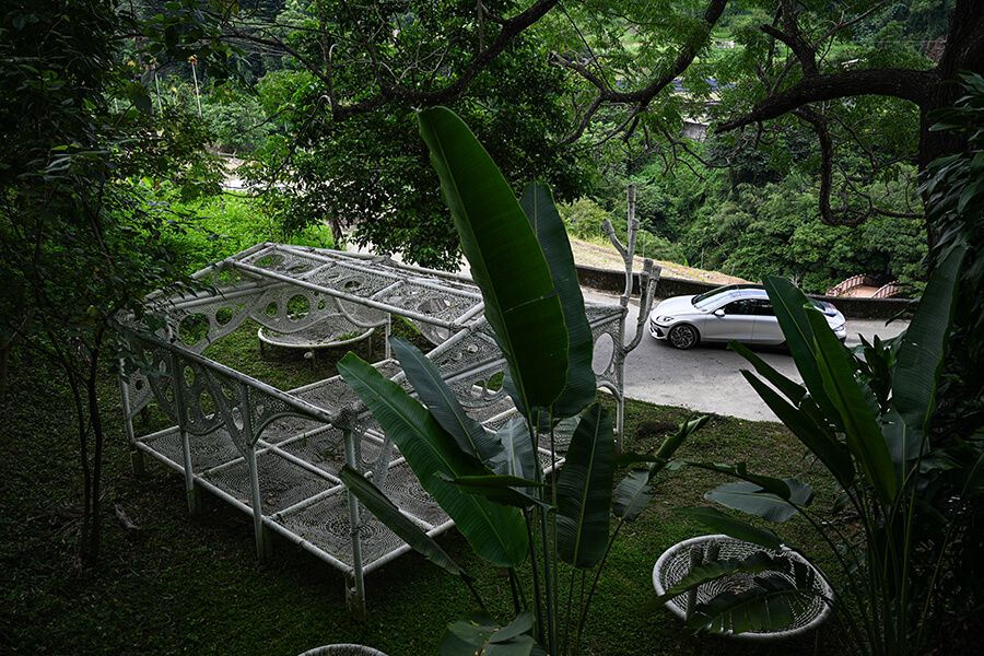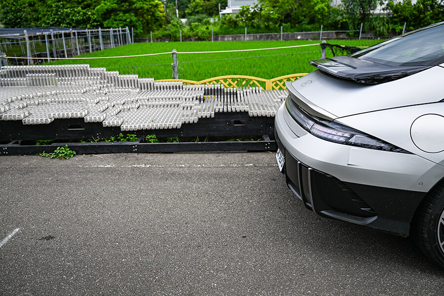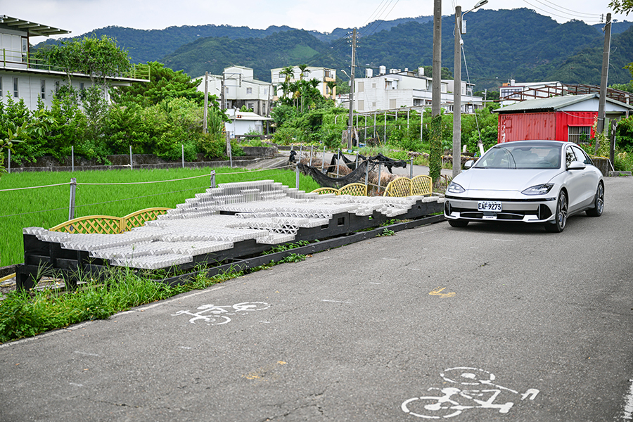 首站東勢除了是離TG根據地最遠的所在,也代表著浪漫台三線迎接過客的南端起點。但我萬萬沒想到,才造訪第一站而已,就差點讓我為藝術犧牲…來到大茅埔庄,此地在開庄之際便在這半山腰引水成圳,順勢作護城河之用;同時還種刺竹、造壕溝、建隘門以防範鄰近的原住民襲擊。而造訪首件作品"米蝦亭"就懸在大茅埔圳上,現地取材構築成圳中擬多齒米蝦的形貌。由於我與Ioniq 6所走的小道是將舊時水圳與後來所修道路相互妥協的結果,因此我們很快陷入在蜿蜒路上,左右輪胎分別壓在車道邊界白線上徐徐前進的尷尬境地。我真想殺一隻大豬公,央求三山國王與祖靈保我全身而退…但其實不用,好在車上備好同步率滿高的環景系統,配上後視鏡的使用與偶爾及時介入的煞停輔助,即便2950mm的長軸距在掉頭時總免不了多幾趟前退後嚕,但一切總有驚無險地平安落幕,在此特別鳴謝當時駕著農機分踞前後的歐吉桑之耐心等候。