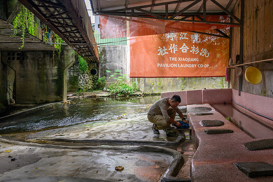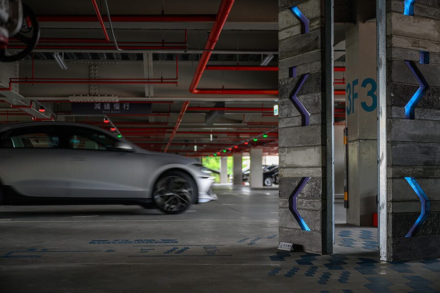 後來我決定轉進竹東市區小歇一會。這兒有許多以自然姿態留存至今的老屋與公共建物,讓此地無處不充滿悠閒氣息。像是由早期輕便車候車亭布置而成的"曉江亭洗衫合作社",反映出一旁東寧橋下「洗衫坑」富含當地婦女利用湧泉在此洗衣、結合一旁在地信仰中心:東寧茶亭伯公廟等生活痕跡。而就連立體停車場車道中也設有心思細膩的藝術品…諸位看懂其中奧秘了嗎?最後的回程途中,我刻意繞進沿途的村莊、田園,以自由探索的方式為這趟藝術之旅端上無菜單料理般驚喜的甜點。所幸Ioniq 6不止金玉其外,內部潔淨優雅的陳設與用料也讓我在匆匆奔波的行程之後,依然存在這副閒情逸致…