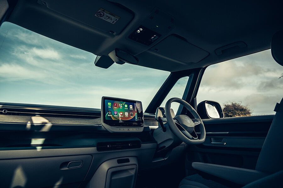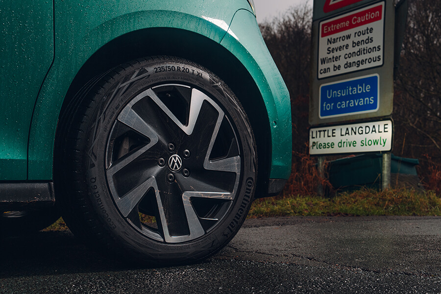 斜率達到百分之三十的Hardknott山路很快映入眼簾。阿Kit停下來查明前路暢通無阻後便一馬當年攀往高處,我則從後追趕。ID.Buzz的舒適駕駛坐姿和輕盈方向盤,很適合應付這種滿佈波浪紋的單線行車道。雖然一舉一動有點笨拙,但車手儘可相信自己的直覺,無視距離感應器經常發出的警告聲。就這樣左扭右扭轉了幾個彎,大夥兒便成功登上山路之巔,對ID.Buzz和eDub來說可謂「大功告成」的一刻。