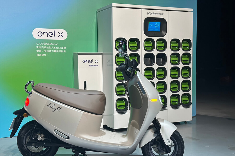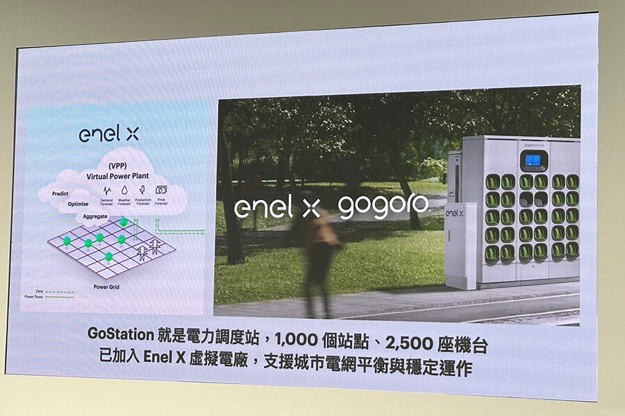 電網的相結合方面,Gogoro攜手創新能源服務及虛擬電廠龍頭 Enel X(義電智慧能源),Gogoro目前已完成部署全台逾 1,000 個電池交換站點、2,500 座機台加入 Enel X 虛擬電廠(Virtual Power Plant, VPP),參與台電電力交易平台的電力輔助服務市場。當電網失衡時,GoStation 能夠安全降載、或在必要時饋電至電網,使其維持穩定運作。這是全球第一個整合虛擬電廠與電池交換能源網路的商轉成功案例。
