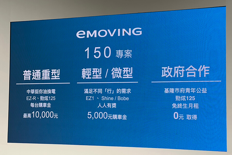 年度記者會同時邀請到 PBGN 聯盟多位合作夥伴:宏佳騰智慧電車、中華汽車 eMOVING、eReady 台鈴智慧電車、YAMAHA 台灣山葉機車、PGO 電動車、威速登科技、義電智慧能源、遠傳電信、鳴日科技,共同展望電動機車與智慧能源新未來。eMOVING 則率先響應淨零轉型,釋出限時「150 專案」優惠 —— 針對旗下白牌、綠牌、微型二輪給予最高 1 萬元購車金,並陸續與各地政府合作推出專屬購車方案,加速電動機車普及。