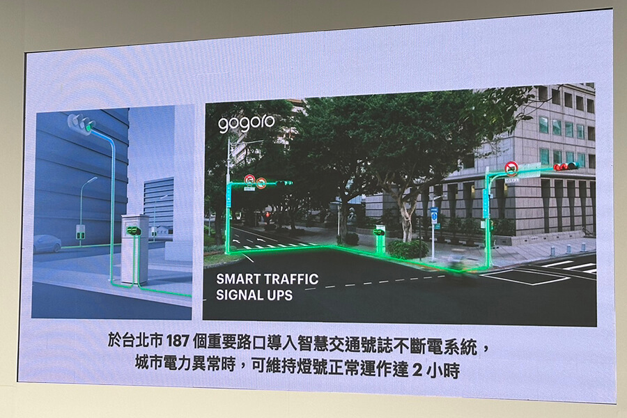 同時Gogoro還與遠傳電信合作開發「智慧交通號誌不斷電系統」,解決城市無預警停電造成交通號誌失靈的風險,並於今年在台北市 187 個重要路口完成建置。在電力異常的情況下,此系統能夠維持燈號正常運作,無縫接軌地守護交通與用路人安全。另外Gogoro Network 智慧電池也還為設於全台六縣市的 756 個智慧停車柱提供電力,打通無紙化與自動化停車管理、以及穩定電源供給的最後一哩路,大幅提高維運效率與停車格週轉效益。