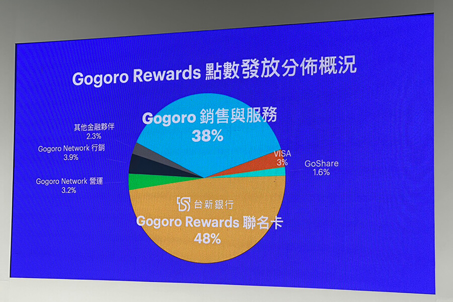 於 2022 年 10 月上線的 Gogoro Rewards 點數獎勵計畫,已吸引 30 萬人使用、台新 Gogoro Rewards 聯名卡發卡量突破 10 萬張,日常消費就能自動累積 Gogoro Smart Points 點數,直接折抵電池資費、購車、維修保養、GoShare 騎乘等任意 Gogoro 消費無上限。Gogoro Network觀察到,Gogoro Rewards 至今已發出 1 億 4 千萬點數,其中 48% 來自聯名卡消費回饋、38% 來自 Gogoro 銷售與服務回饋。9,058 萬點數用於直接折抵資費帳單,佔已使用點數的 82%,加上「綠點」動態折價與 Gogoro Rewards 點數折抵,每位車主平均每月享受低至 66 折的資費帳單優惠。