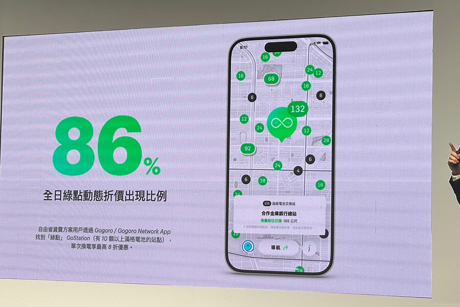 現在,訂閱自由省資費方案用戶的車主只要打開 App,就能找到附近的「綠點」 GoStation(有 10 顆以上滿格電池的站點),在「綠點」單次換電即享最高 8 折的動態折價6 優惠。根據 Gogoro Network 內部數據顯示,全日綠點折價出現比例高達 86%,至今已為車主減免 $6,080 萬資費。
