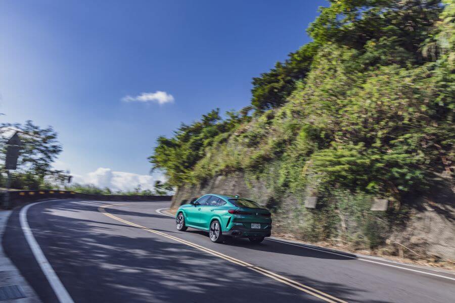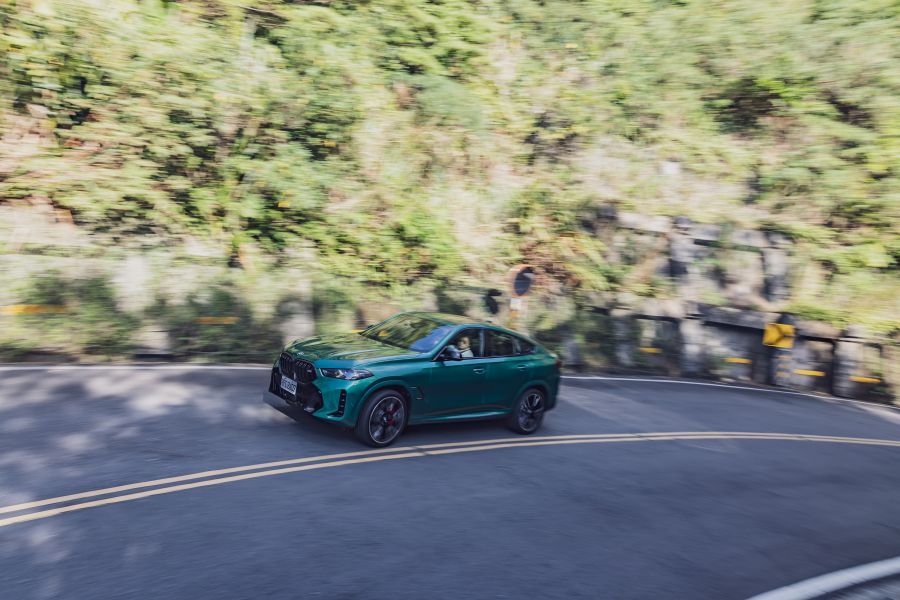 一般移動的親切宜人當然不會是X6 M60i的全部,隨著換進運動模式,還有變速箱本身的半獨立模式變換,寶馬確實擅長賦予車輛各種不同的動力變化與駕駛反應的組合,最好玩的設定無非就是Sport Plus配上S檔狀態,整個動力系統的銜接默契便進入絕妙狀態,這530匹確實能讓人恣意發揮,而且不會造成駕駛人的精神壓力;這時配上M版特調的懸吊、後差速器的動力分配以及後軸轉向營造出極其快速的彎道反應時,反倒讓我一開始有點跟這大號車身無法連結,但很快地就開始欣賞寶馬帶給車輛進出彎動態的奧妙之處,開始連續試招也輕鬆應對,不過畢竟體態還是不算太輕盈,多留一點空間給煞車會讓整個駕駛過程更加流暢有趣。