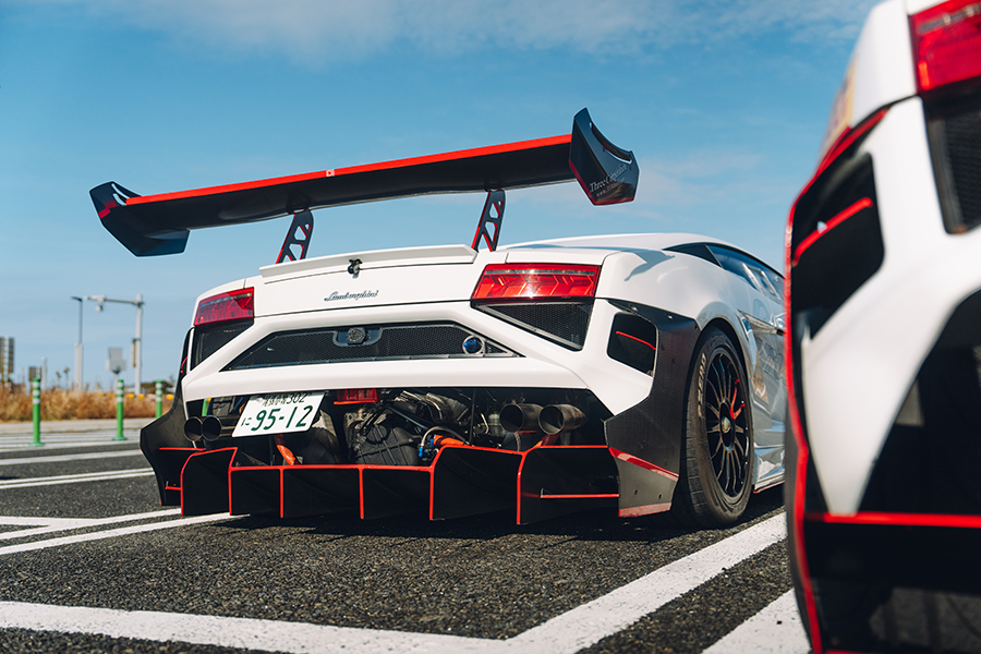 來到名古屋這邊,玩法便較為死硬派,武田康忠(Yasutada Takeda)的林寶堅尼Gallardo Super Trofeo賽車便是最佳例子。這部林寶裝有氣壓千斤頂和Perspex車窗,車底離地距小到以毫米計,唯一透露其合法街車身份的線索,就是車尾那個偏置一旁的車牌。