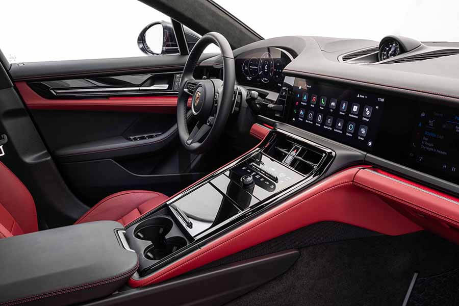 這有點像…不,是幾乎跟新款Cayenne一模模一樣樣吧?!確實,不管是弧形的12.6吋數位儀表、12.3吋中央觸控螢幕,還是使用特殊薄膜、藉以使駕駛無法看到的10.9吋乘客螢幕等基本硬體設施皆大致一樣。不過當視線延續至下方,就會發現新款Panamera的車內安排比起Cayenne更加封閉:斜斜落下的中控接續著中央螢幕下方的冷氣出風口,融入其中的一些實體開關與旋鈕則顯得更接近駕駛握持方向盤的位置,同時中央置物空間顯然也變得更大一些…。等等,那麼排檔機構呢?請將目光繞過方向盤,控制排檔地線傳機構現在就位在雨刷撥桿後方、儀表與裝央螢幕的交界處…。