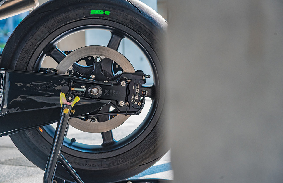 在懸吊部分結合出極端做法,將Öhlins避震器下掛在車台正下方,不若一般常態懸掛在車輪及車架當中,而油箱融合座椅的一體式模組堪稱Winston近年來得意之作,除了便以拆裝之外還保有獨有風格,前叉維持長度740mm一直是個人長久以來認定的黃金比例,透過量身定做的CNC三角台配上山葉R1的Öhlins前倒叉, 除了可預期的穩定性大幅增長,更是視覺觀感不可或缺的一員,而下盤的BST碳纖維輪框套上Beringer卡鉗,以上即可保全三元素無一缺席,這一切看似完美進行中,老天卻在此時開了一個大玩笑,Winston忘了在後搖臂上焊上關鍵的卡鉗機構,正所謂山不轉路轉,這狗急跳牆可跳出一個絕活而來,Winston異想天開設計出與調鏈器一體成型的卡鉗轉接座,這破天荒的後遺症可說叫好又叫座,至於早嚇出一身冷汗的Winston看來總算能有個好眠。